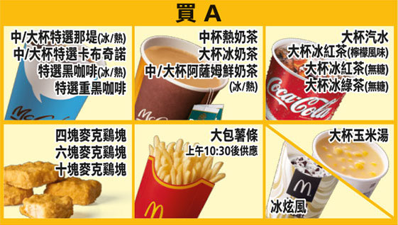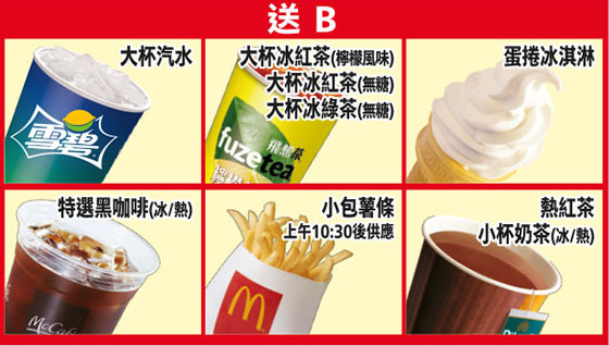 ▼全新甜心卡部分產品因停賣而更換選項,A區新增了阿薩姆鮮奶茶、特選重黑咖啡等飲品,原本的麥克雞塊也從4、6、9塊變成可以選擇4、6、10塊。