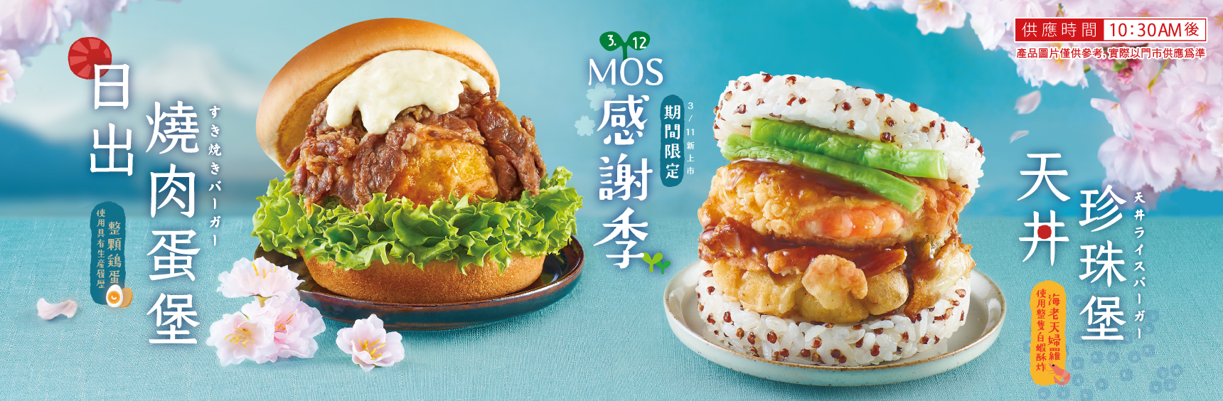 ▼除麥當勞外,摩斯漢堡的28歲生日感謝祭,也推出新產品「天丼珍珠堡」與「日出燒肉蛋堡」,供應期間自即日起到4/30號。
