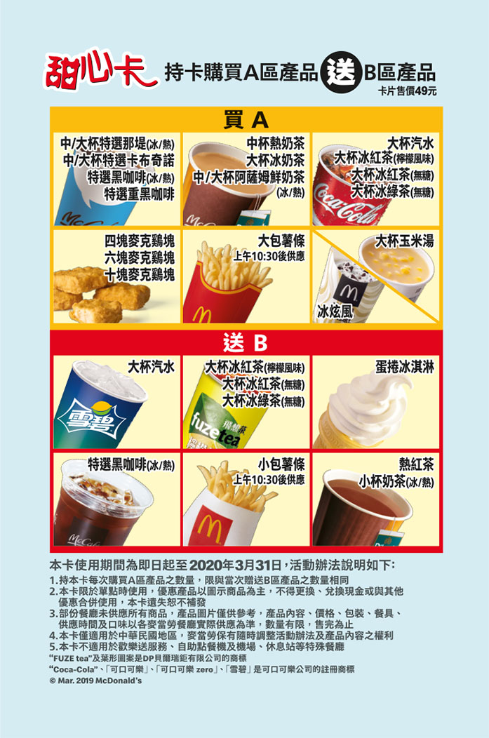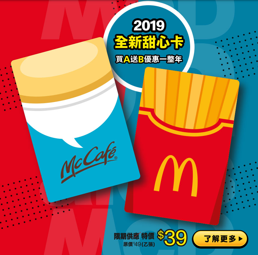 麥當勞2019全新甜心卡自即日起販售至4/9,售完為止,優惠價每張39元(原價49元),使用期限到2020年3月底為止。
