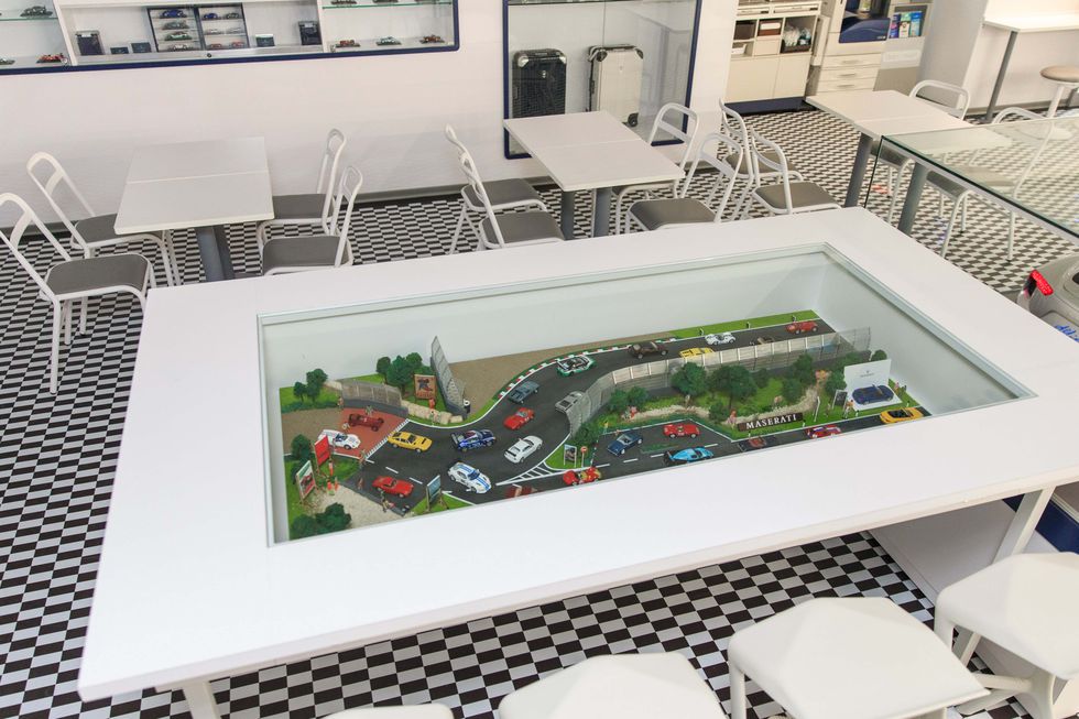 ▼對具特色的就是日內瓦門市「瑪莎拉蒂聯名店」啦!整個空間除了利用瑪莎拉蒂品拜代表色藍、白色為主,地面也採用賽車格圖案,連商品陳列櫃都有精心設計過,不知道還以為誤會走到精品專賣店呢!