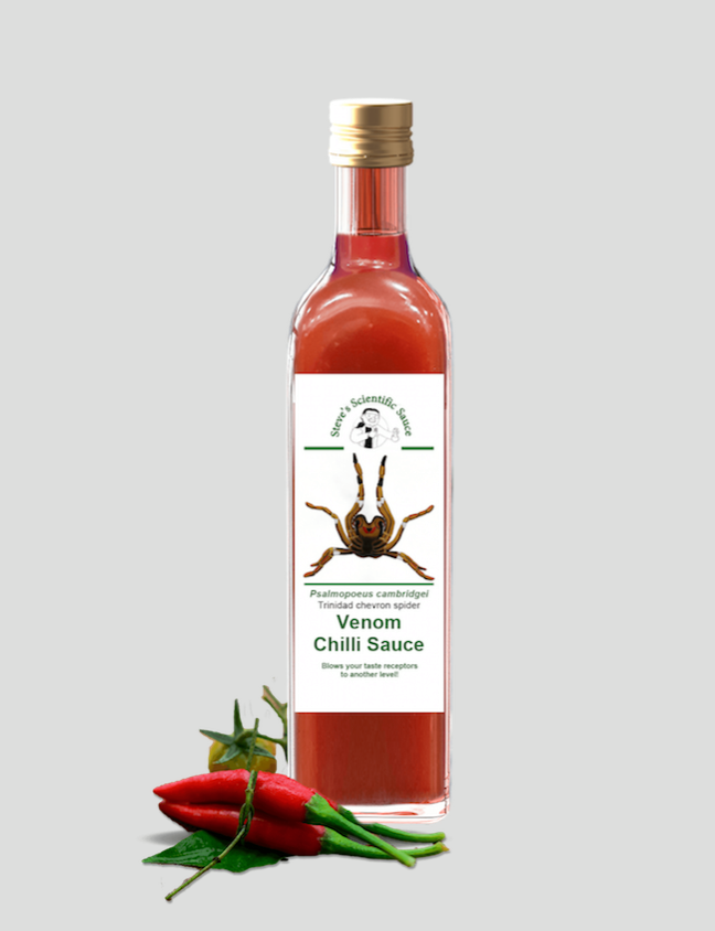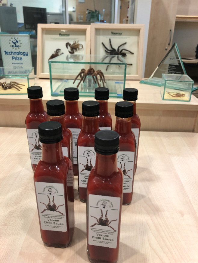 ▼最初這只是製藥公司的附屬計畫,要研究蜘蛛毒液製藥;後來史蒂芬研究了「千里達蜘蛛(Trinidad chevron spider)」的毒液,做出「猛毒辣醬(Venom Chilli Sause)」模擬被咬的灼燒及酸麻感。