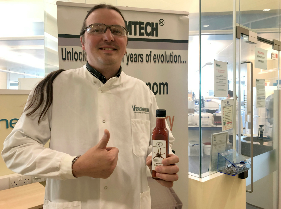 ▼這項異想天開的商品之所以產生,是因為史蒂芬在兩年前(2017)某次會議上遇到了一位食品業務,古莫(Stefano Cuomo)。「我們花了很久研究蜘蛛毒液,發現千里達蜘蛛的毒帶給人的感受跟辣椒很像;」史蒂芬說:「兩年前那場會議上,我們突然靈光一閃。」