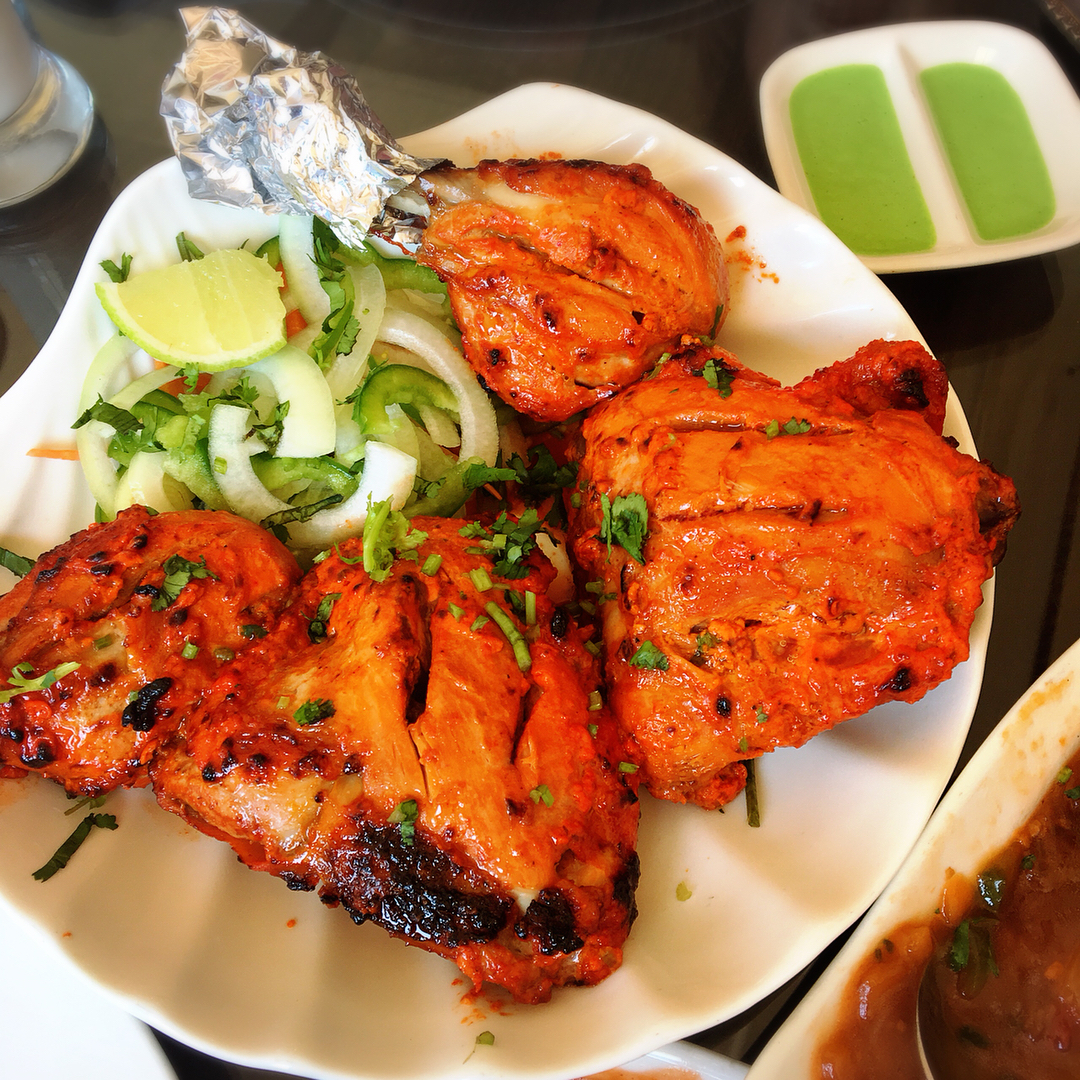 ▼6.「坦都」印度料理:除了印度料理中常見的羊肉咖哩、花椰菜馬鈴薯咖哩之外,還有一樣特別的「菠菜咖哩」;微焦的烤餅帶著誘人的焦香色澤,跟各色咖哩都非常搭。用鐵板上菜的烤雞腿、香嫩多汁,也是店裡招牌。