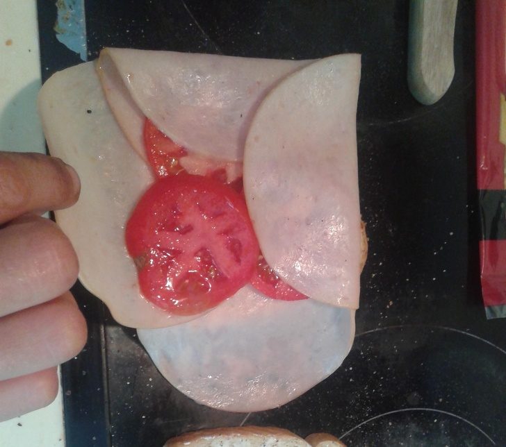 把火腿切成薄片,將蕃茄包進去,再夾進三明治裡,你的番茄就不會滑來滑去囉!