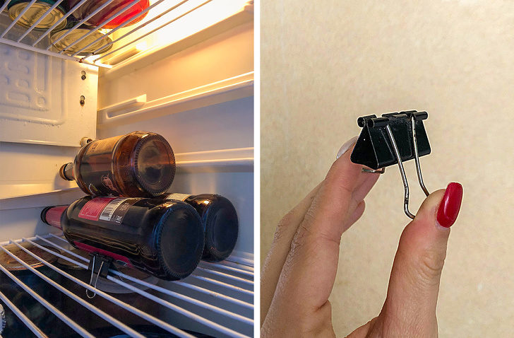 拿出長尾夾,固定在冰箱裡的鐵架上,就可以順利把瓶罐固定住囉!