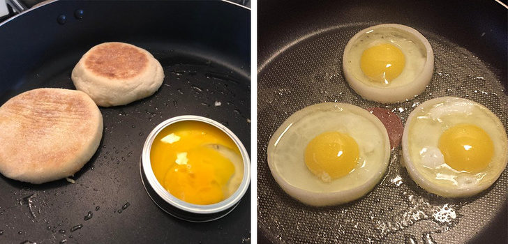 拿出一個罐子的蓋鐶,放進鍋裡,把雞蛋打進蓋環之中,雞蛋就不會流動啦!也可以用洋蔥圈替代哦,說不定會蹦出新料理~