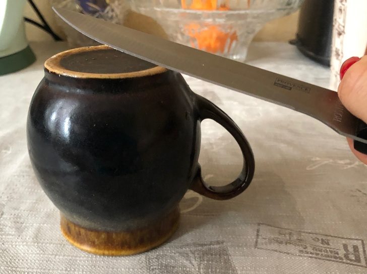 假設沒有磨刀石,又臨時需要磨刀?可以將馬克杯反著放,底部粗糙的部分可以磨,倘若你的刀子是較為昂貴的,就不建議這麼做了,要乖乖去買磨刀石哦!