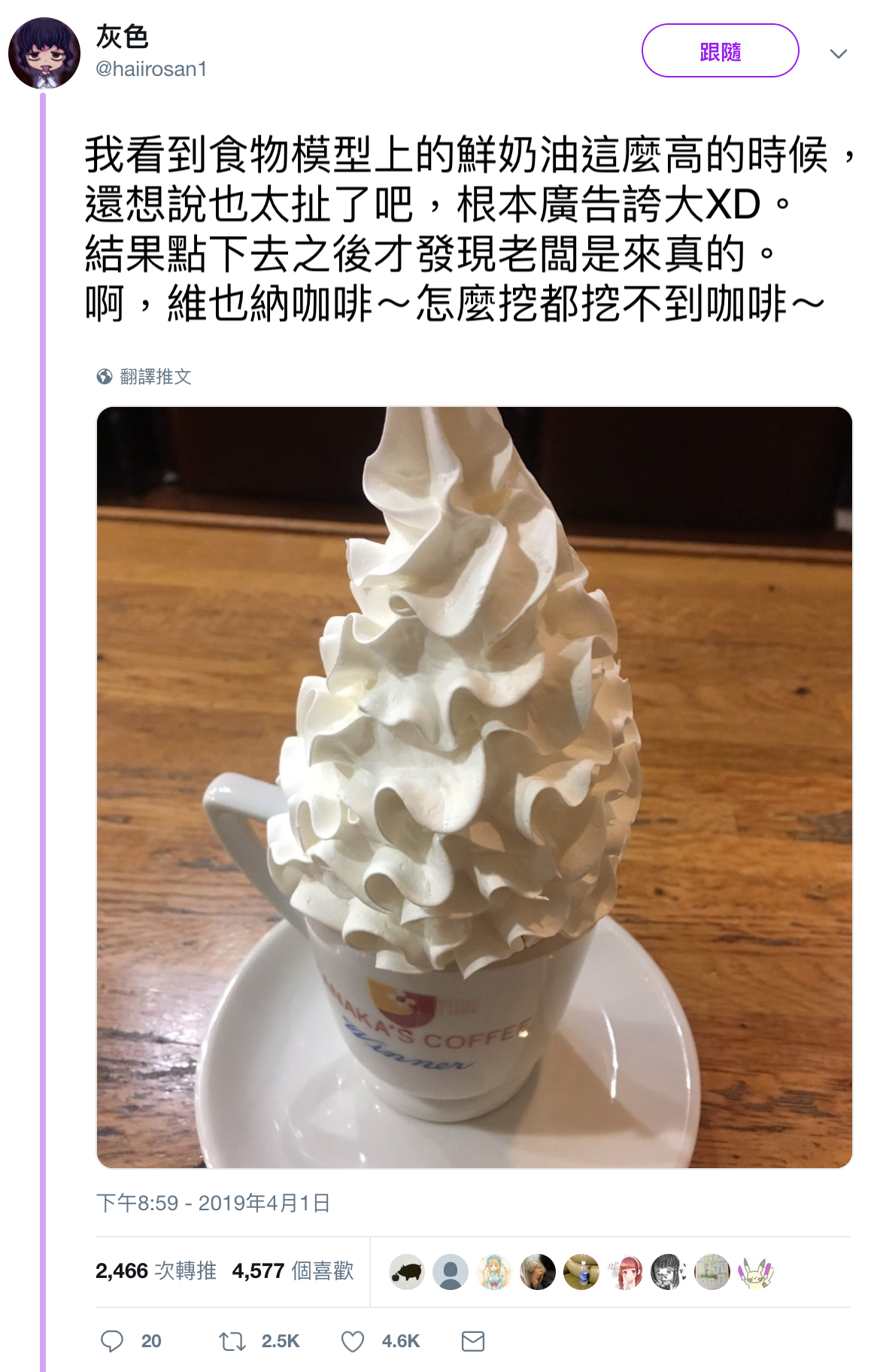 2019年04月14日一杯熱騰騰的咖啡、擠上濃郁醇厚的香甜鮮奶油,苦澀與甜味成絕配的「維也納咖啡」是日本許多咖啡廳都很有人氣的一道飲品。不過名古屋一家咖啡廳的維也納咖啡讓不少人都傻眼,原因是鮮奶油真的太多了…