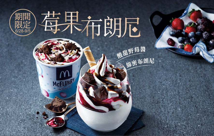 ▼雖然沒有聖代系列產品,但是愛吃冰品的朋友也別灰心,自4月17日至6月25日止,麥當勞推出期間限定、好評回歸的「莓果布朗尼冰炫風」,堪稱冰炫風系列最好吃的一款!