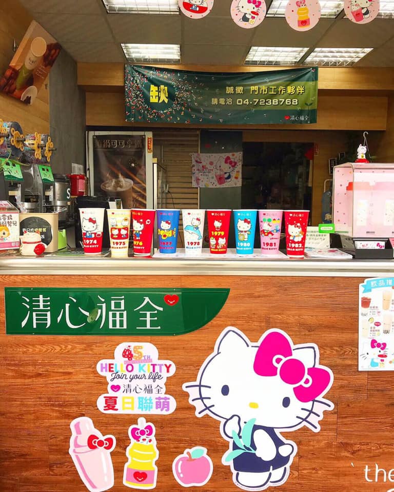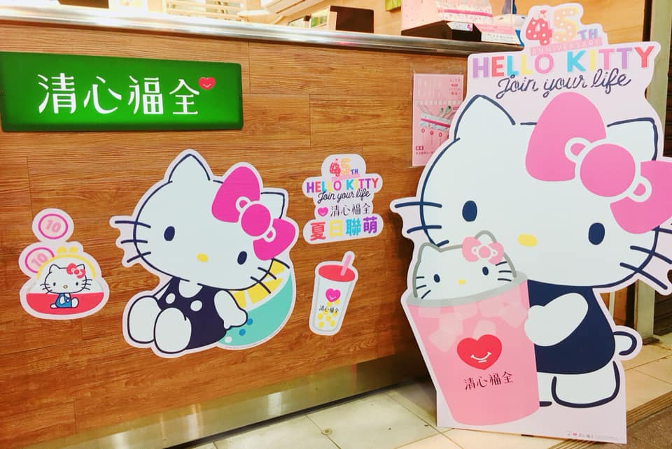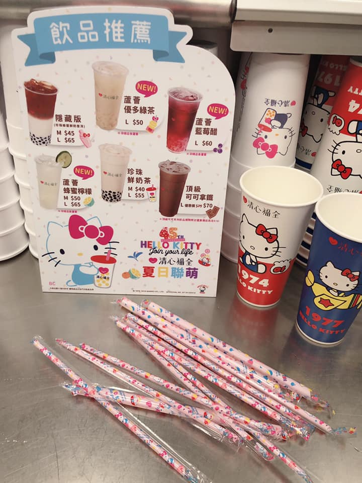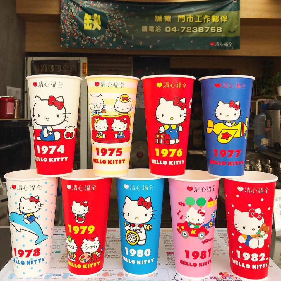 2019年04月17日Kitty迷注意!今年夏天可以合理的喝飲料了!席捲全球的Hello Kitty今年邁向45週年,與手搖飲清心福全聯名推出活動,不僅在門市可以看到可愛的Hello Kitty立牌,連店內裝飾也有可愛Kitty的身影,除此之外,還推出Kitty的造型生日杯,在每個主題杯上印上年份,讓粉絲們可以收集自己的「生日杯」。