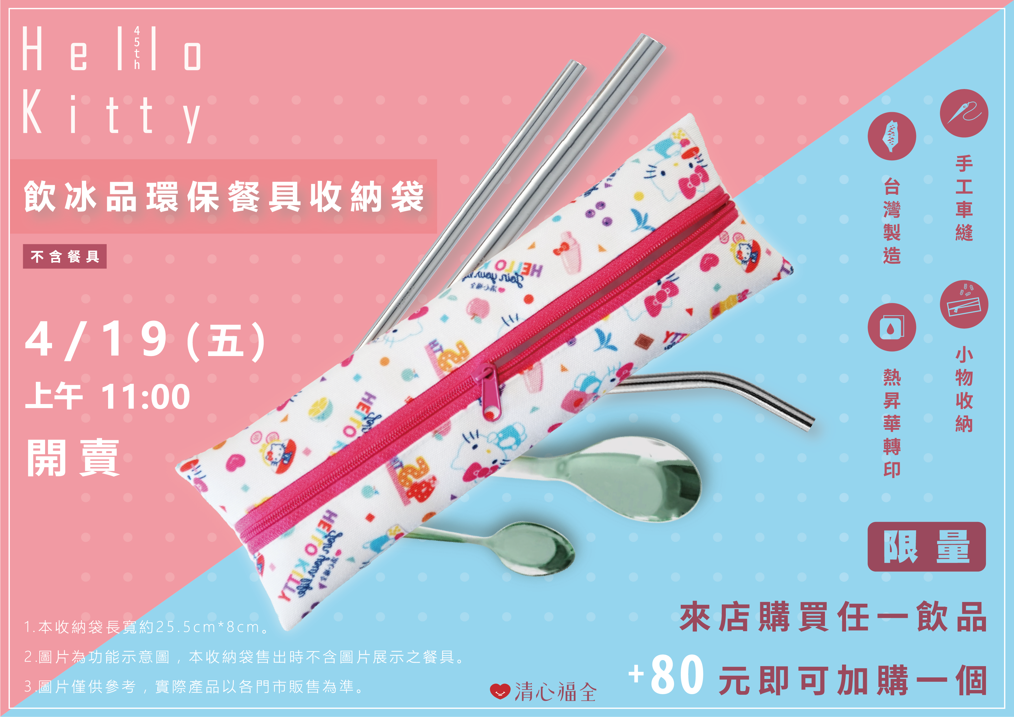 ▼「夏日聯萌」在4月15日起跑,第一波推出的生日杯款為1972年至1982年,有不同的造型Kitty,還有配合活動限定推出的「紅麴紅粉圓」。第二波活動將於4月19日開始,屆時會推出加購活動,到店消費再加購80元,可以獲得台灣製造的手工車縫Kitty環保餐具收納袋,活動持續到8月15日,在這期間會陸續推出周邊。