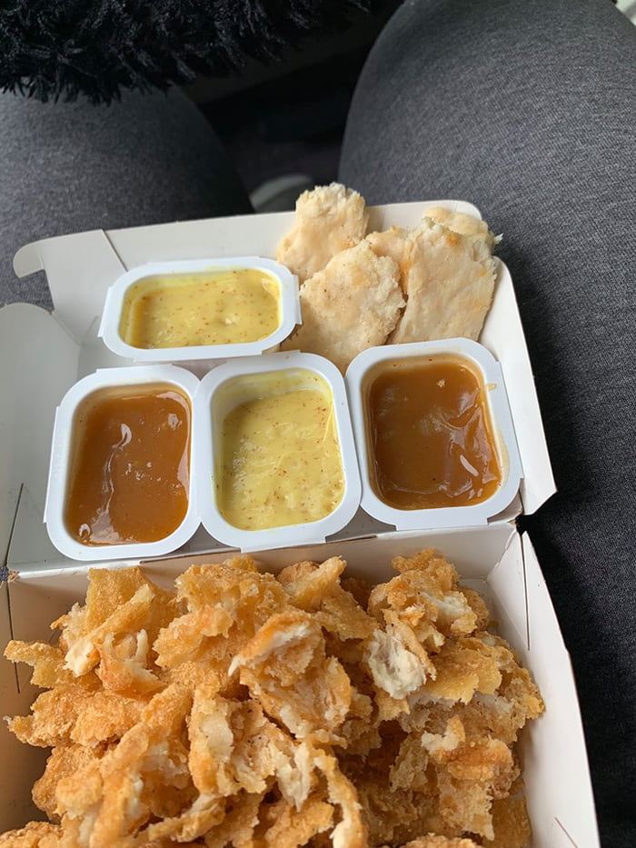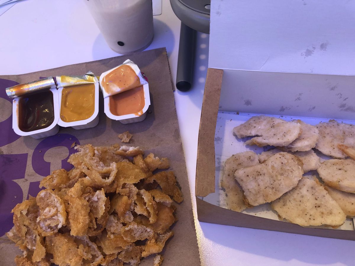 ▼Sameer在臉書上po了一張外帶的麥當勞雞塊照片。一份雞塊配4種不同的蘸醬,看起來很豐盛。但他竟然把雞塊酥脆的外皮剝下來,與白色的雞肉分成兩堆放。Sameer問:「你們都會剝掉雞塊的皮嗎?」