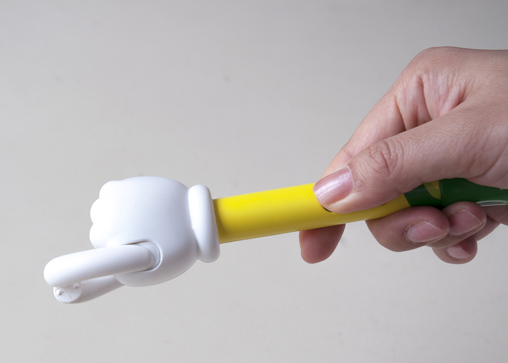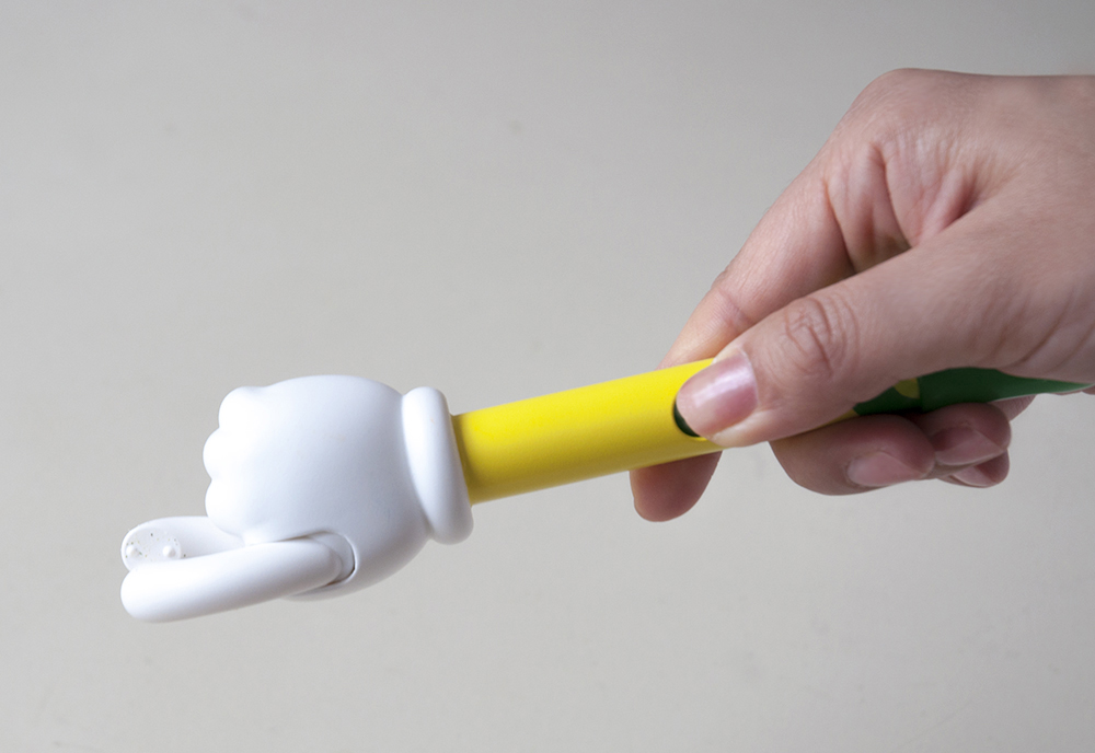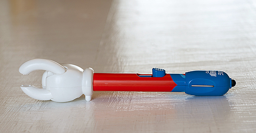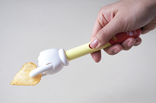 ▼只要對著筆上的按鈕輕輕一壓,洋芋片手就會抓起洋芋片。洋芋片手之中還內藏了特別機關,就算使用者按得非常大力,洋芋片也不會因為用力過猛而被壓碎。