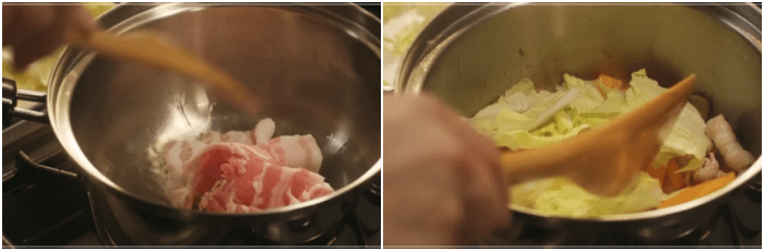 ▼2.熱鍋下油,依序放入豬肉、大蒜、白菜翻炒。