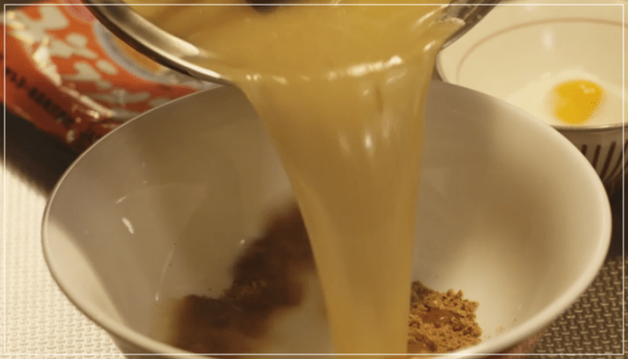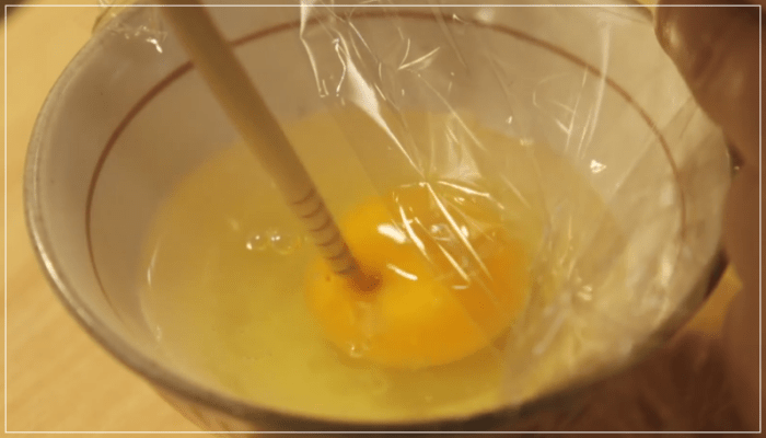 ▼4-1.等待水燒開的期間,可以先做半熟蛋:將蛋打入加入少許開水的碗中,用筷子將蛋黃戳破(避免微波時爆開);用保鮮膜包好後,以中小功率微波40秒。