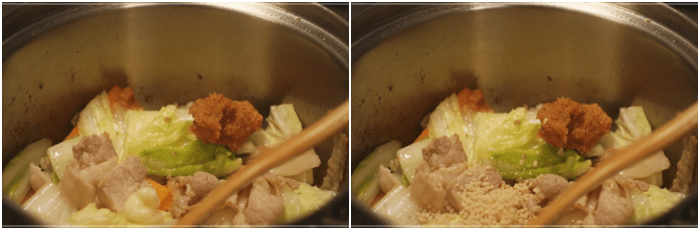 ▼4.加入蒜泥、味噌、味醂、高湯粉及500毫升的開水,等待水滾。