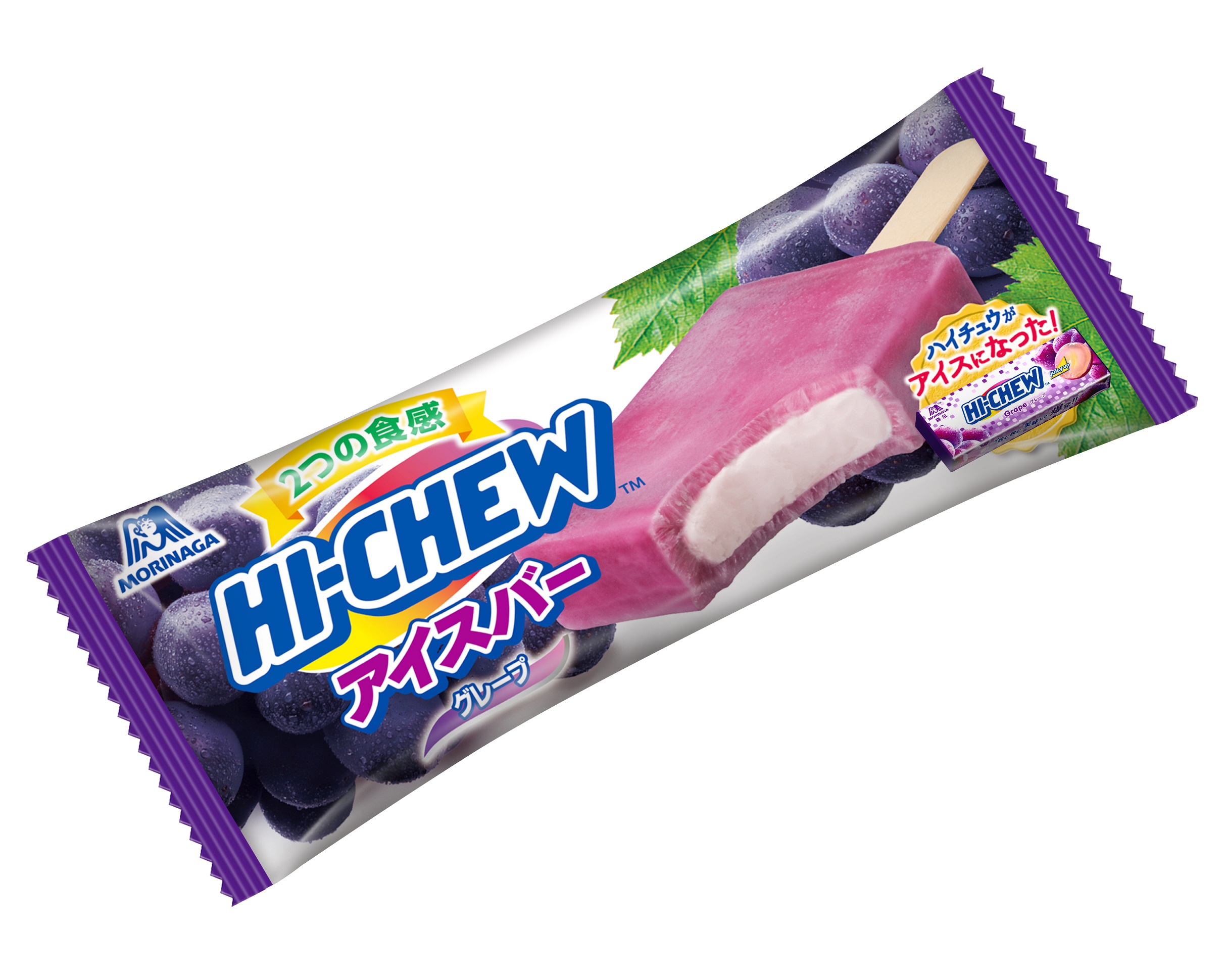 ▼「森永嗨啾葡萄冰棒」售價59元,高人氣的嗨啾軟糖做成冰棒,外層是葡萄酸甜風味的雪酪口感,內餡是綿密滑順的乳霜狀內餡冰淇淋,雙重口感。
