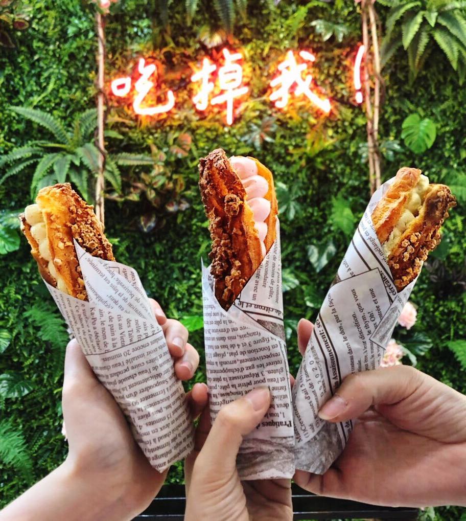 ▼位在高雄新崛江百貨旁的「吞吞手作泡芙」,店內裝飾很夢幻,有一面網美牆,讓各位客人拿著手上的泡芙來這裡拍沙龍照~