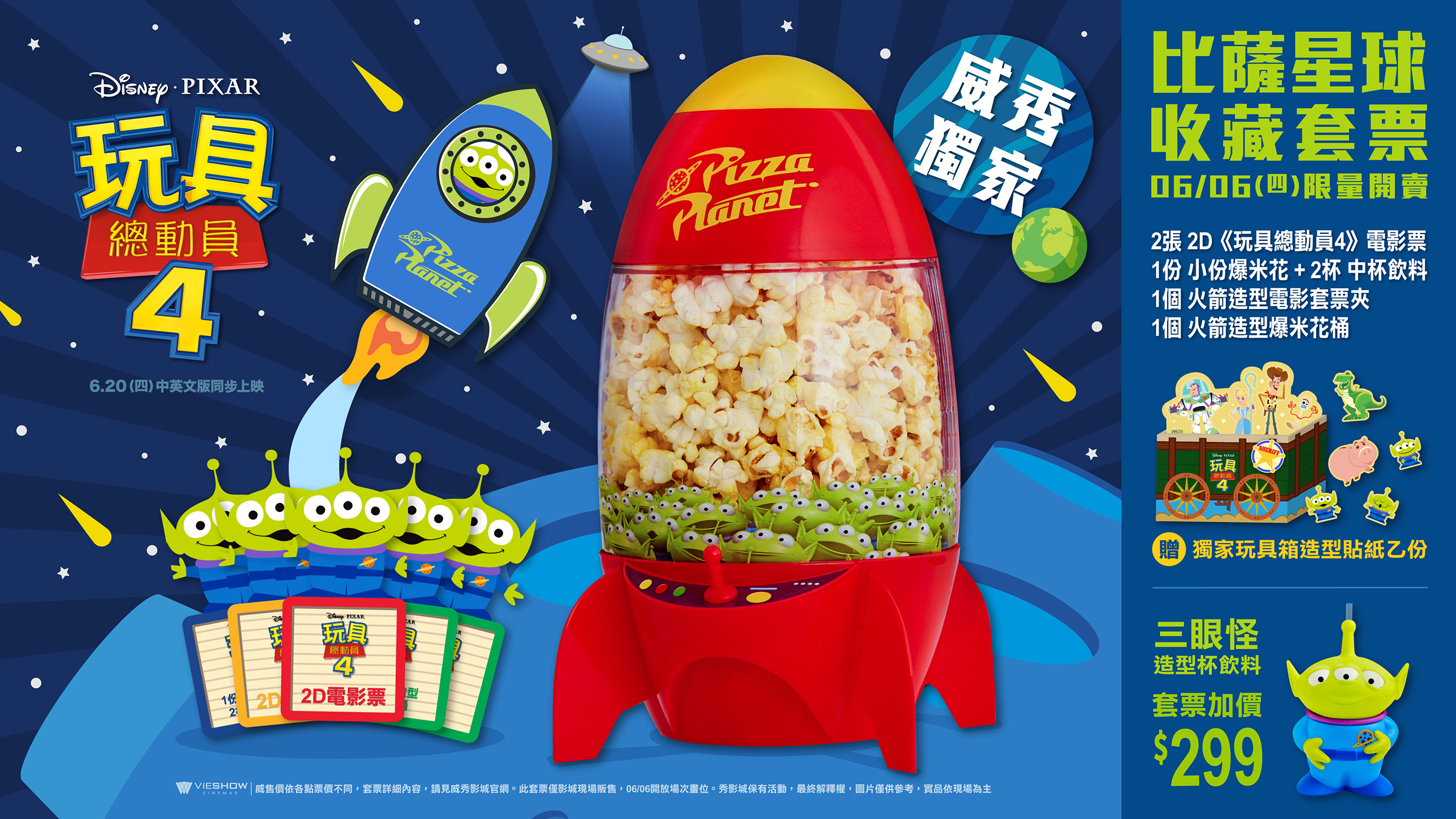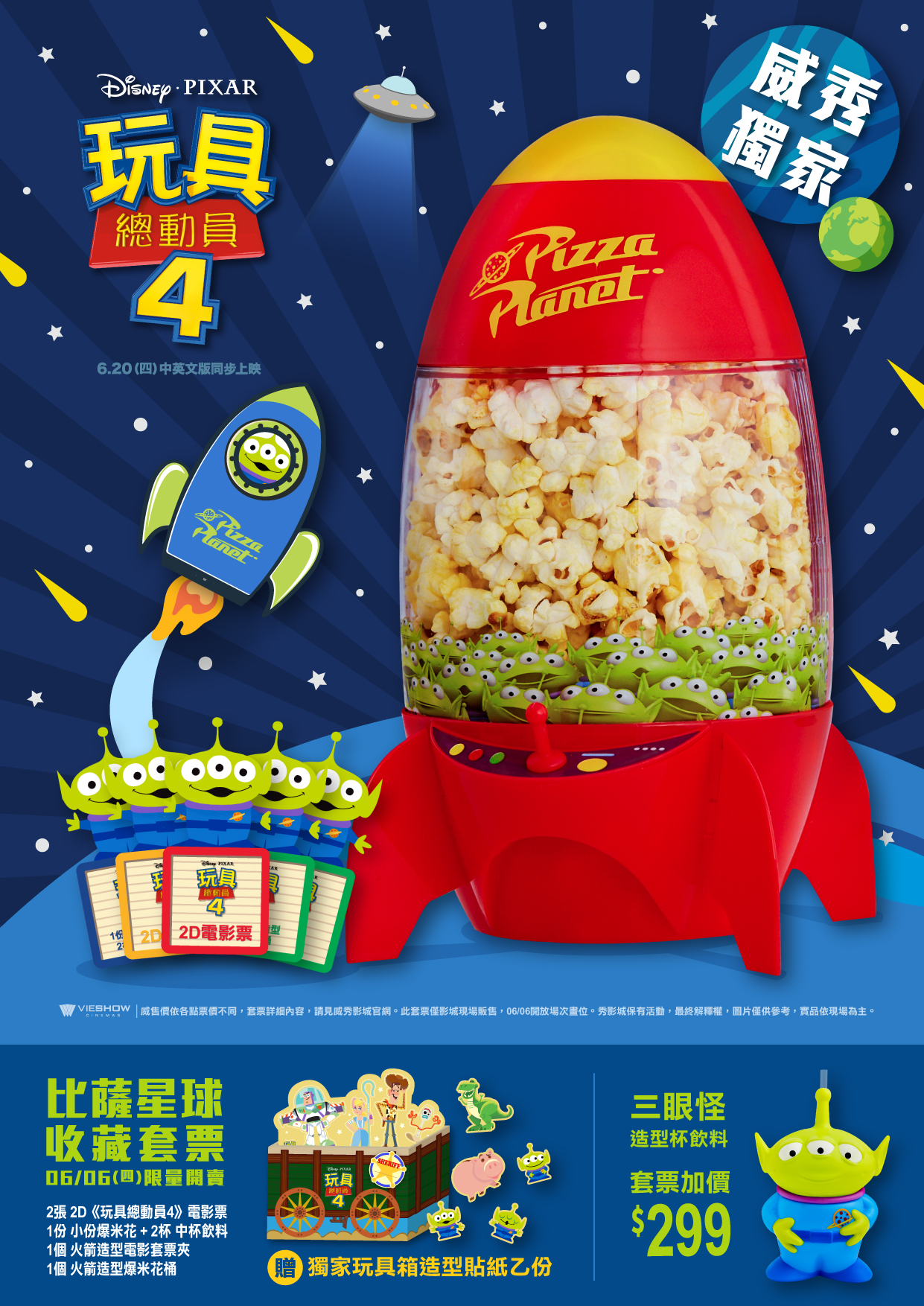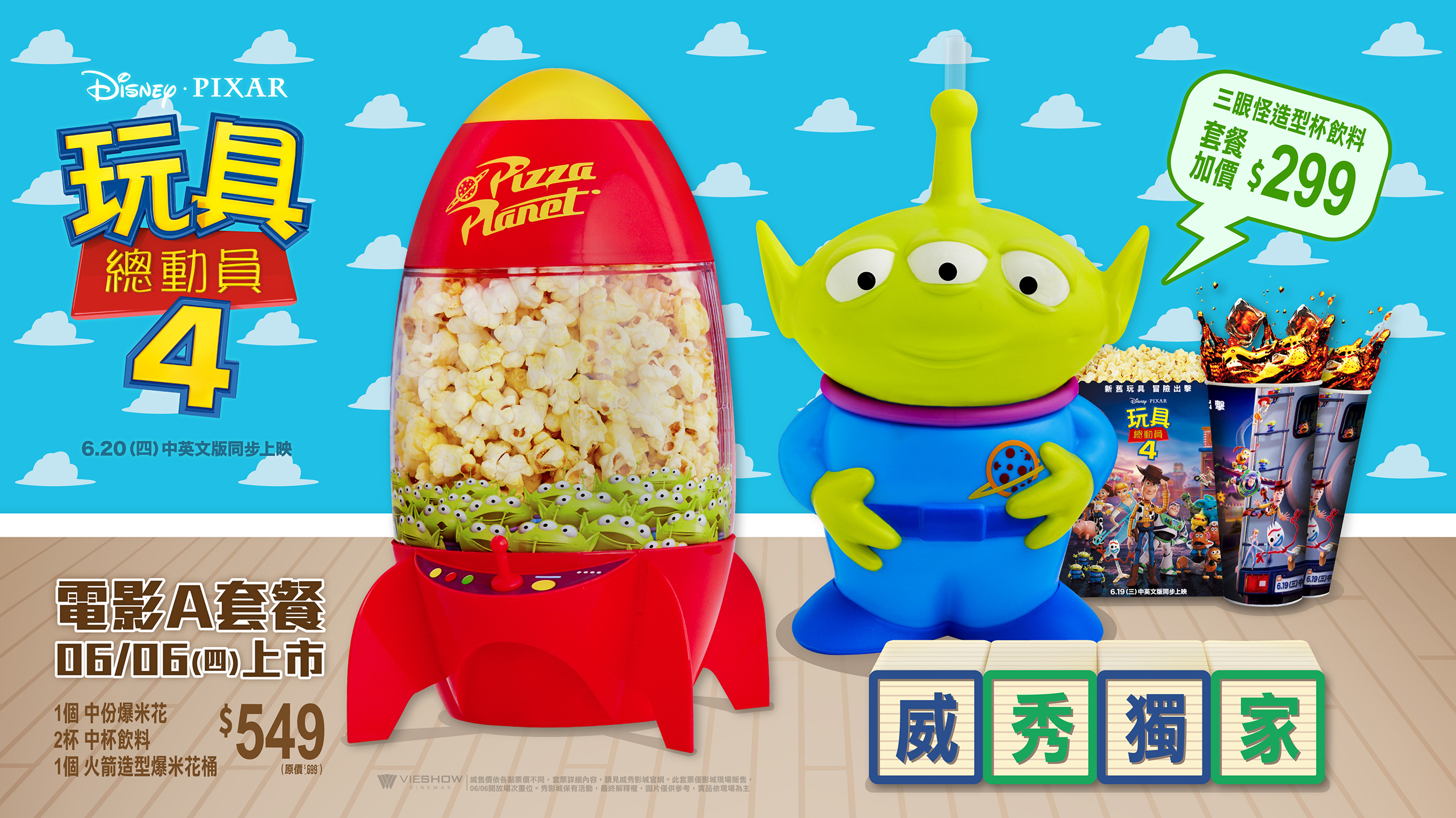 ▼【玩具總動員4】電影A套餐內容為:1個火箭造型爆米花桶+1份中份爆米花+2杯中杯飲料=$549 (原價$699),另外套餐可以加購$299購買「三眼怪造型杯飲料乙個」,電影A套餐同樣於6/6(四)全台威秀影城獨家上市。(數量有限,售完為止)