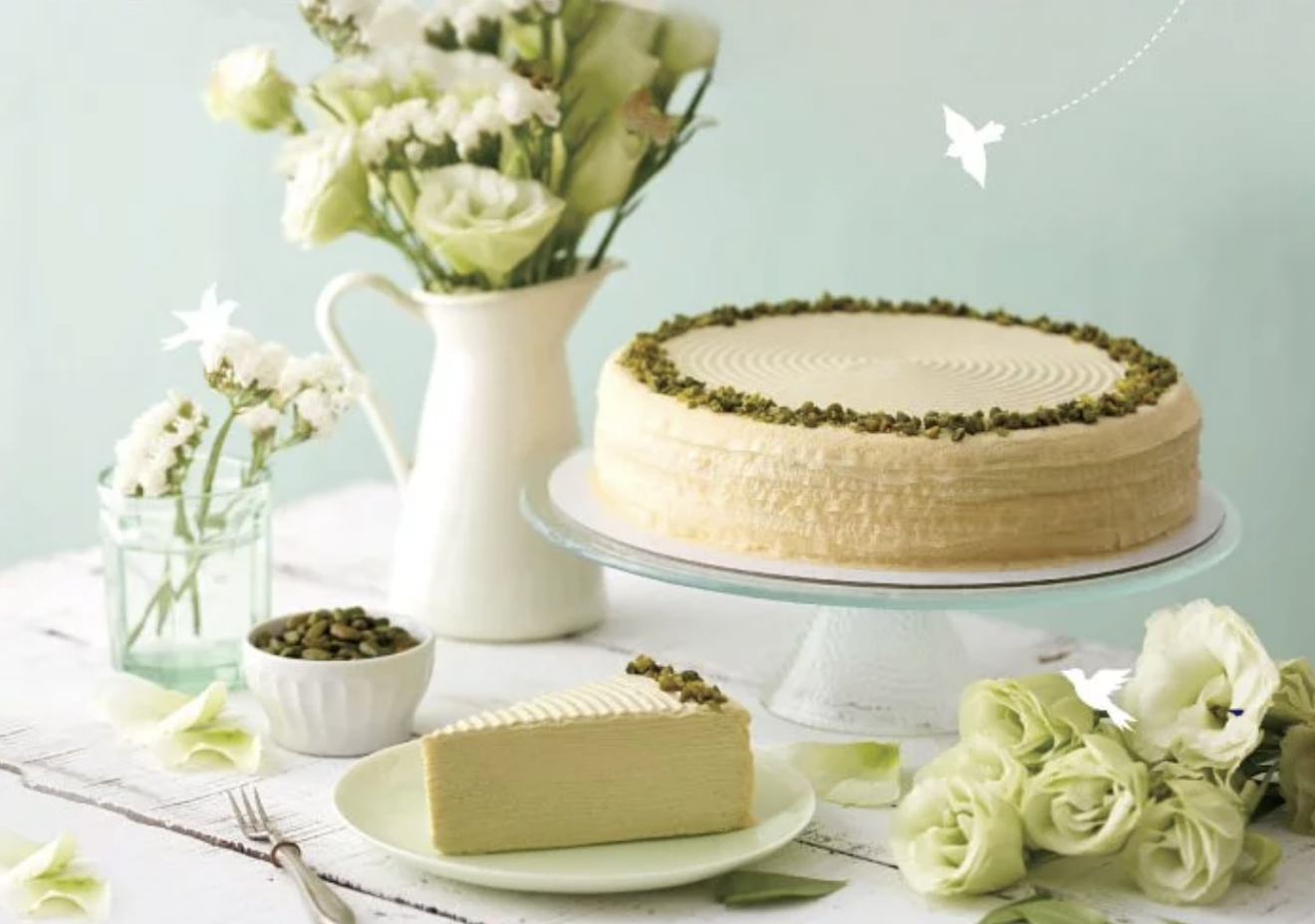 選用義大利西西里島的開心果製成的「義大利開心果醬」,有著香濃的堅果氣息,搭配鮮奶油與卡士達,調配成開心果卡士達,塗抹在層層蛋皮之間,最後在頂層撒上開心果碎粒裝點。