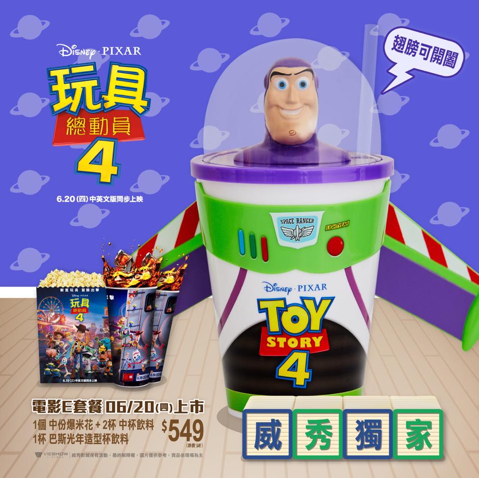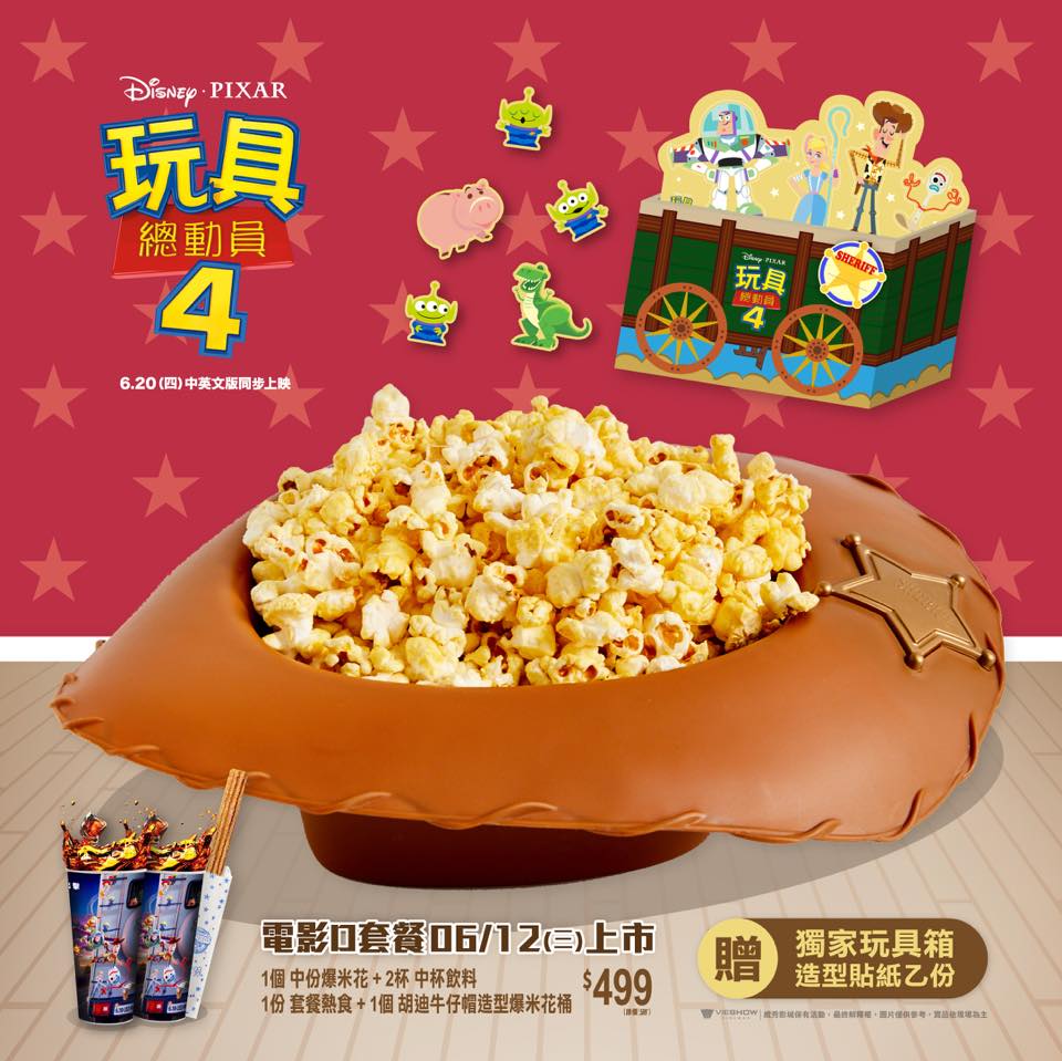 2019年06月11日《玩具總動員4》即將上映啦!威秀影城之前就炒熱第一波商品「火箭爆米花」跟「三眼怪飲料杯」,現在又狂推第二波超值雙人套餐,共推出4種不同電影套餐:獨家限量版「巴斯光年飲料杯」、「胡迪牛仔帽爆米花桶」等,要來搶攻玩具總動員控的市場!6/12起開賣,大家快點手刀衝啊~