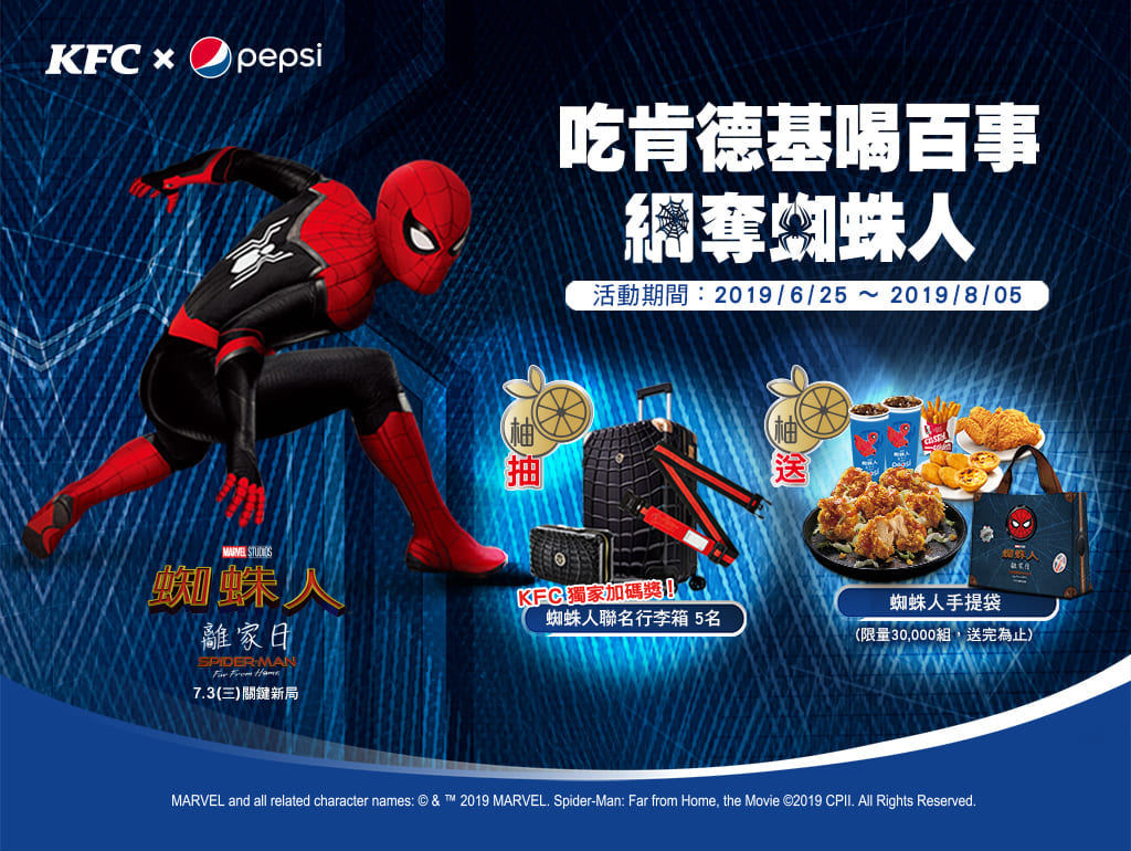 ▼電影《蜘蛛人:離家日》即將在7月上映,肯德基也趁機攜手百事可樂,聯名《蜘蛛人:離家日》,加碼送「蜘蛛人手提袋」,只要購買指定套餐就能得到,還能憑發票抽「蜘蛛人行李箱」,數量有限,蜘蛛迷千萬不能錯過!
