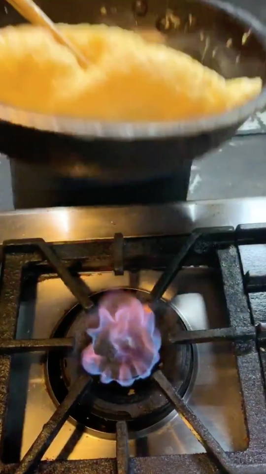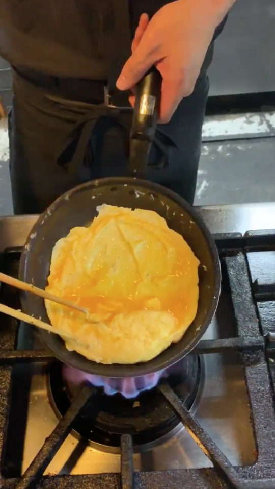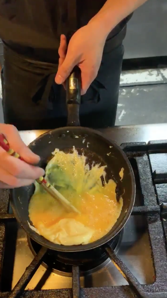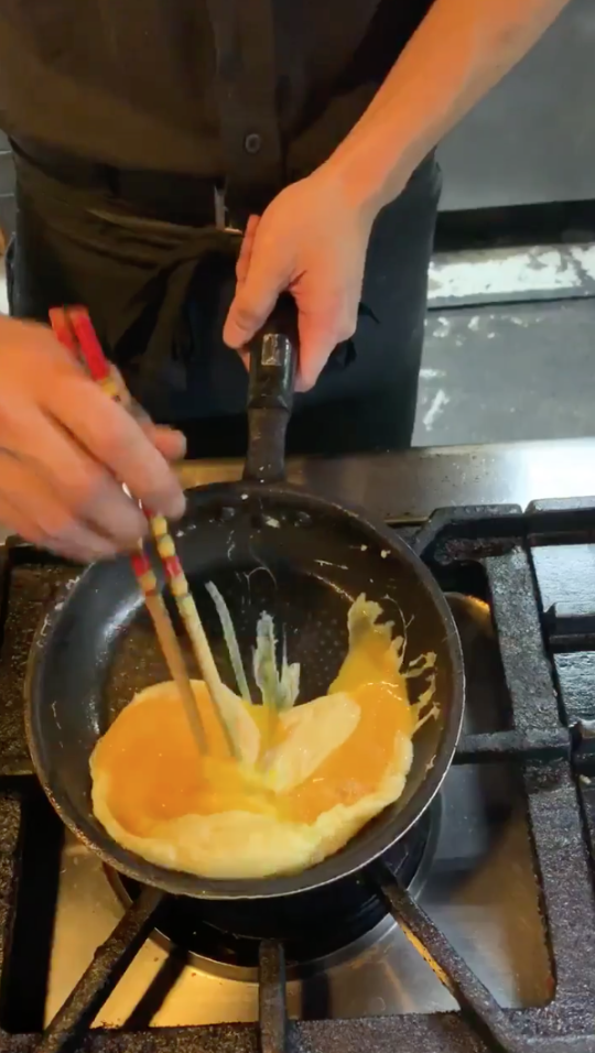 ▼然後再往後轉鍋子一圈,讓未熟的蛋液散佈均勻。