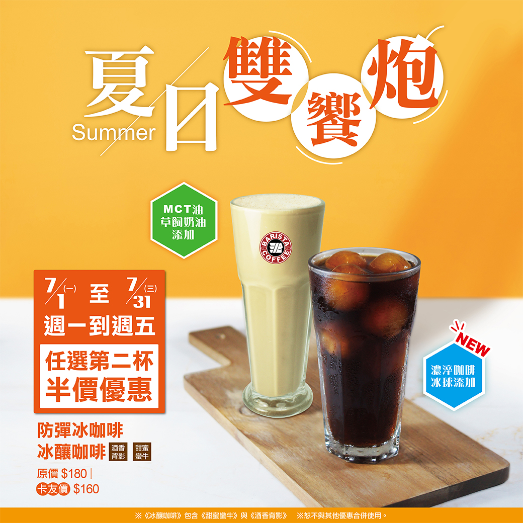 ▼除了星巴克以外,西雅圖咖啡推出「夏日雙響炮」優惠活動,從即日起至7/31號,平日期間(週一至週五)購買防彈冰咖啡/冰釀咖啡可享第二杯半價優惠。
