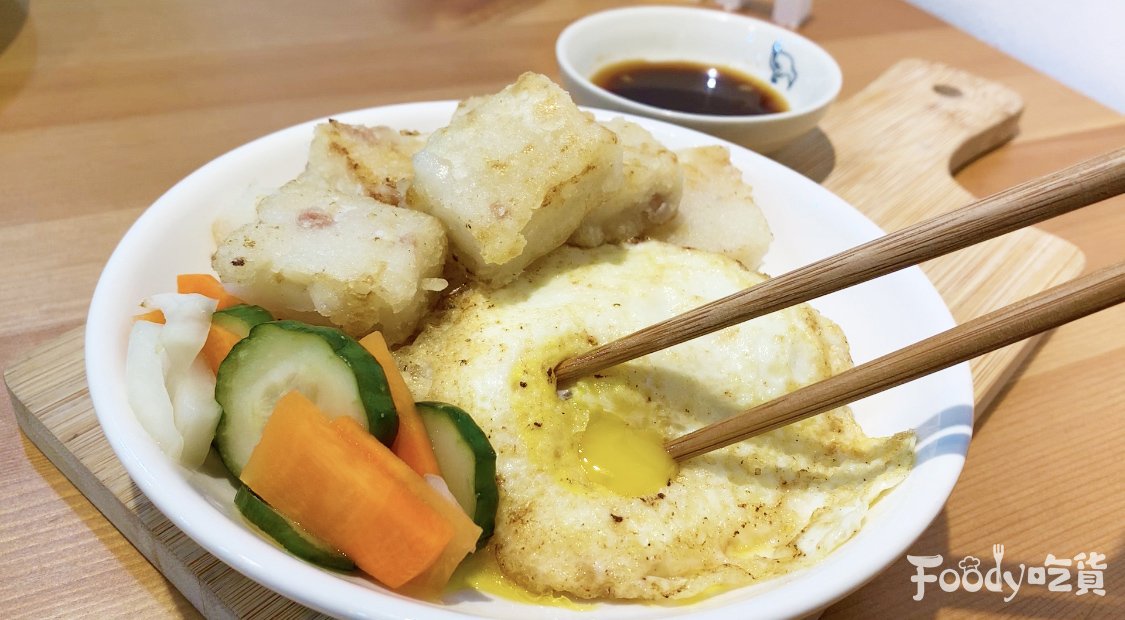 ▼醬油也是店家自製醬油,吃起來不會過鹹,剛剛好的調味搭配清爽的黃瓜漬物,再配上一顆半熟蛋,什麼是幸福?吃一口蘿蔔糕就知道了!另外,店內有販售「整條生蘿蔔糕」,但是因為沒有加入防腐劑,最多只能存放兩天,且數量有限,如想購買可詢問店家預定!