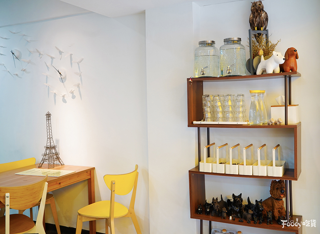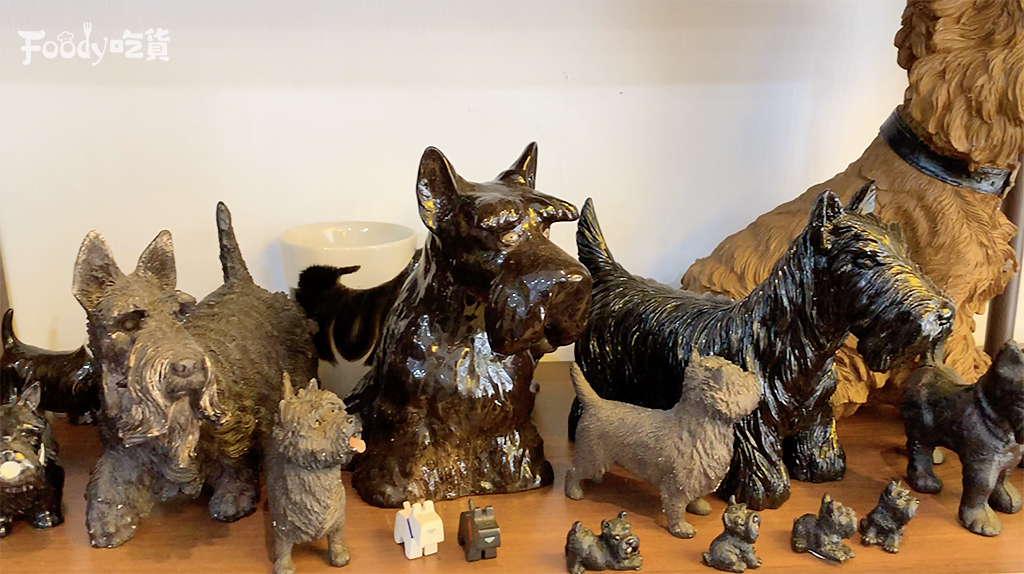 ▼用餐區有餐具、飲用水自助台,仔細看會發現會發現有一層全部都是梗犬的裝飾品,原來是老闆自家有飼養蘇格蘭梗和短毛臘腸,其中蘇格蘭梗Oki還曾經拍攝過品牌平面照呢!