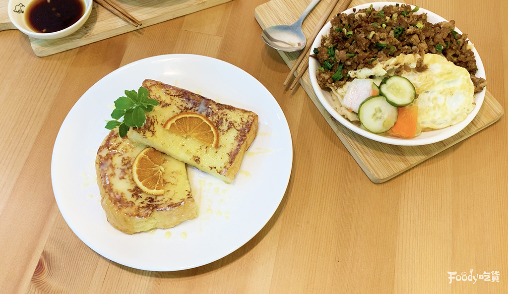 ▼吃飽喝足後就想來份甜點,老闆在七月份推出新品「法式吐司」,使用高價位的鮮奶吐司,吃起來鬆軟綿密,搭配自家製的果乾橙片,橙片的柑橘香氣和煉乳香甜完美平衡,把它當作早餐的最後回合再好不過了!
