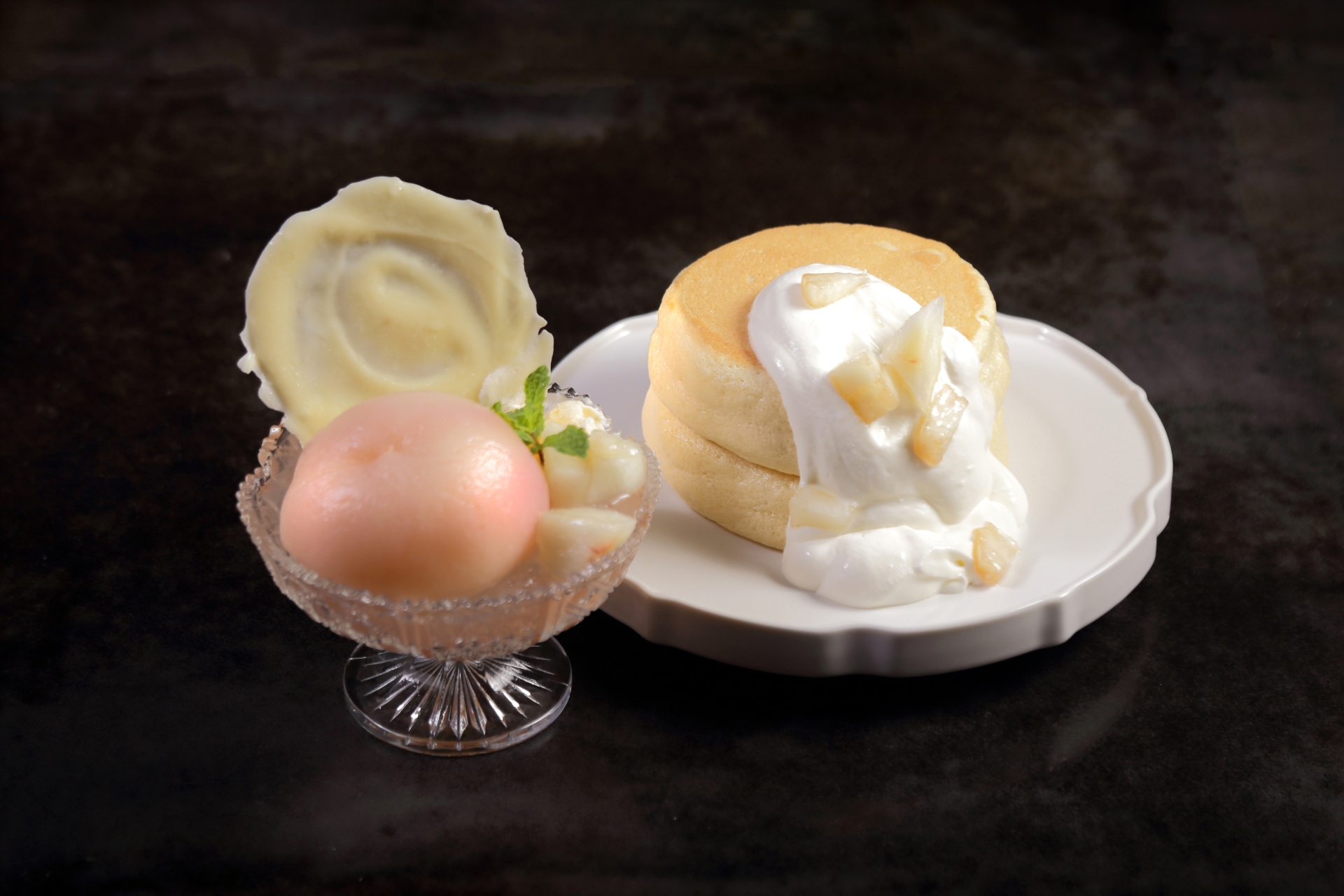 1.「哈密瓜厚鬆餅」:選用每週從北海道空運來台的哈密瓜,在室溫下自然熟成3至4天,使得哈密瓜甜度全面提升;搭配北海道牛奶冰淇淋、洋甘菊果凍與鮮奶油一起享用,簡潔俐落的外觀卻是帶來多重享受、各種不同的滋味分明、卻又彷彿融為一體。
