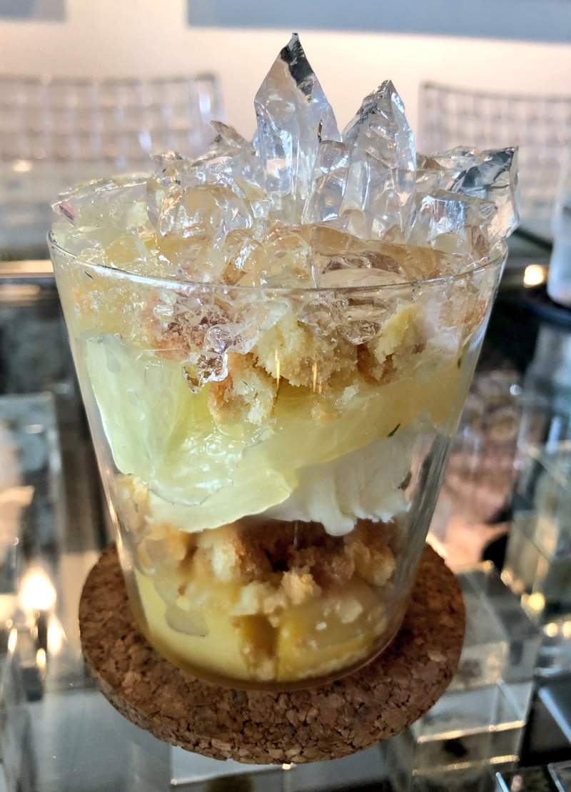 ▼上方大顆的水晶,其實是寒天加砂糖所製作出來的,而周圍的碎結晶則是用了白蘭地果凍,下面母岩的部分利用檸檬凍、糖粉奶油細末、蜂蜜漬葡萄柚、百里香、乳酪冰淇淋、切塊芒果等食材,營造出漂亮的層次感。