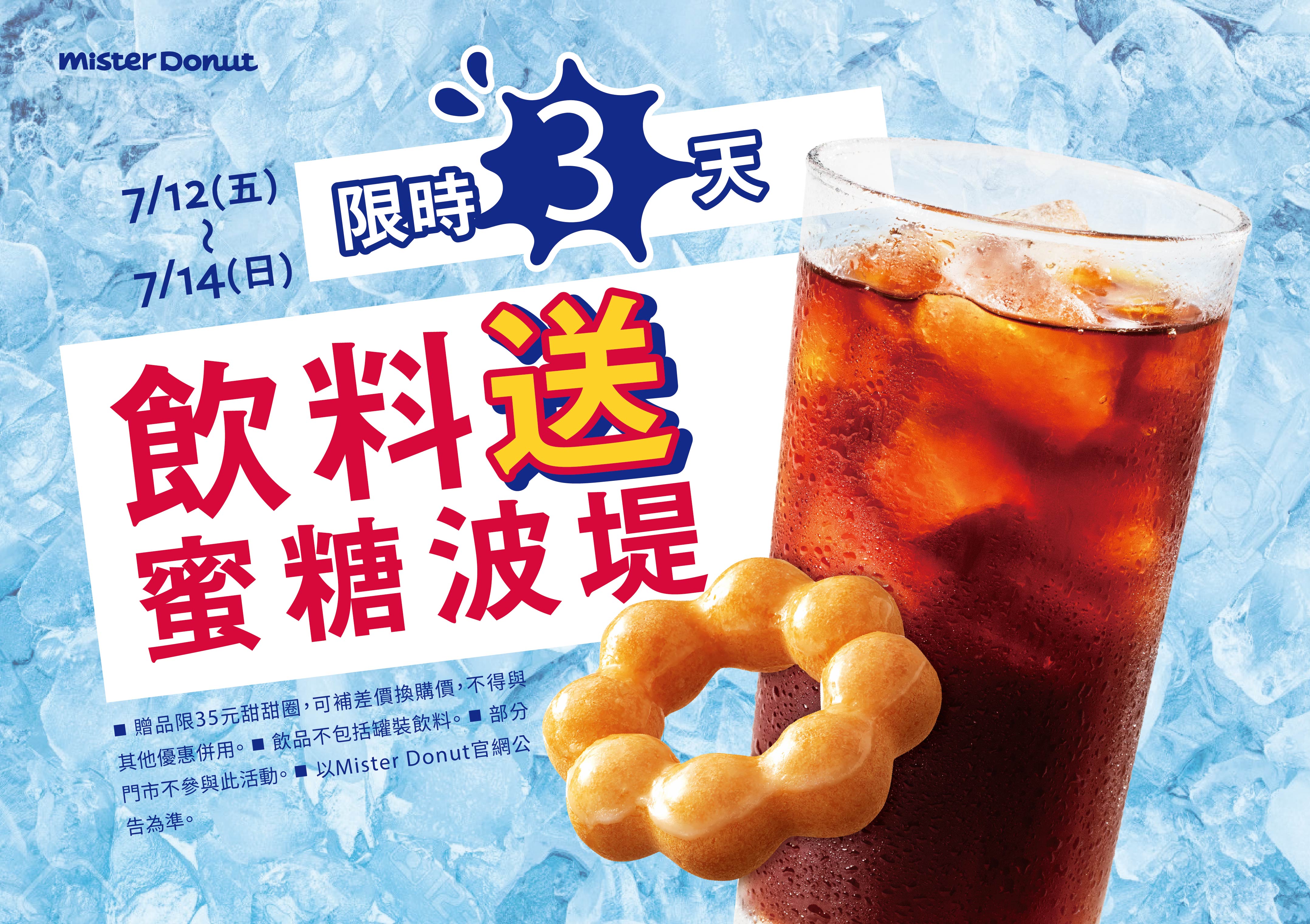 ▼Mister Donut這個週末(7/12-7/14)還推出「冰夏甜甜時光」限時買一送一,只要購買任一現做飲品就送蜜糖波堤一顆,甜甜圈粉趕緊手刀衝!