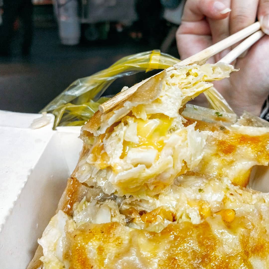 ▼4.蔬菜大蛋餅:可別被招牌上的「肉鬆」兩個字嚇到了,老闆說明,煎台都只煎蛋餅,而肉鬆口味則是起鍋後才加入肉鬆,因此可以放心大快朵頤。這間的蛋餅「餅如其名」,很大一份、可以吃很飽。雖然加入大量生菜,但是吃起來並不會有過生、過水的口感。濃郁的起司、煎得恰到好處的蛋與餅,跟爽脆蔬菜搭配,一大份轉眼間就吃完了!