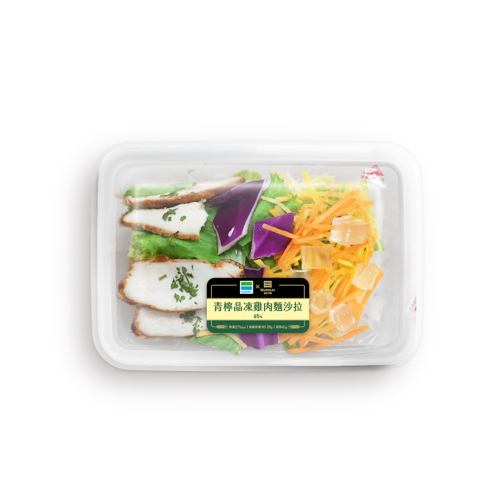 ▼青檸晶凍雞肉麵沙拉(65元):雞腿排以皮爾森啤酒醃漬,法式的口感吃起來香嫩而不柴,再以五種蔬菜與晶凍點綴,佐以青檸蛋黃醬搭配天使細麵,清涼開胃無負擔,夏天最適合吃這道!(7/24上市)