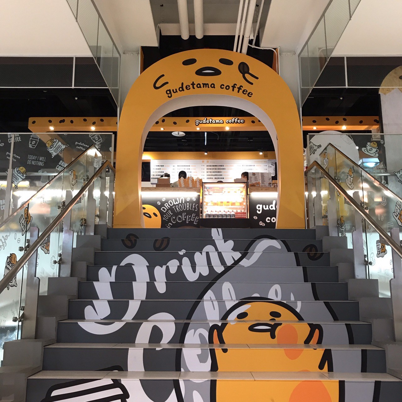▼位在新竹大魯湳雅廣場的「蛋黃哥快閃咖啡廳」,入口是大大的蛋黃哥拱門階梯,手上還有拿著咖啡豆呢!