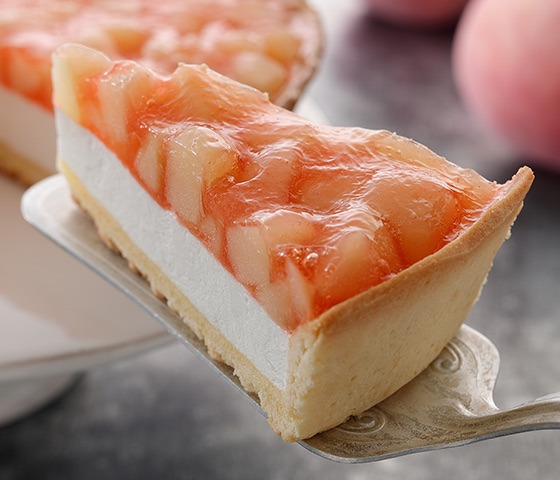 ▼「水蜜桃生乳塔」:蛋糕餅皮、牛奶慕斯與大量看得到果肉的水蜜桃果醬,三種不同的口感與風味層層堆疊,香甜中帶著微酸,是初戀的味道~