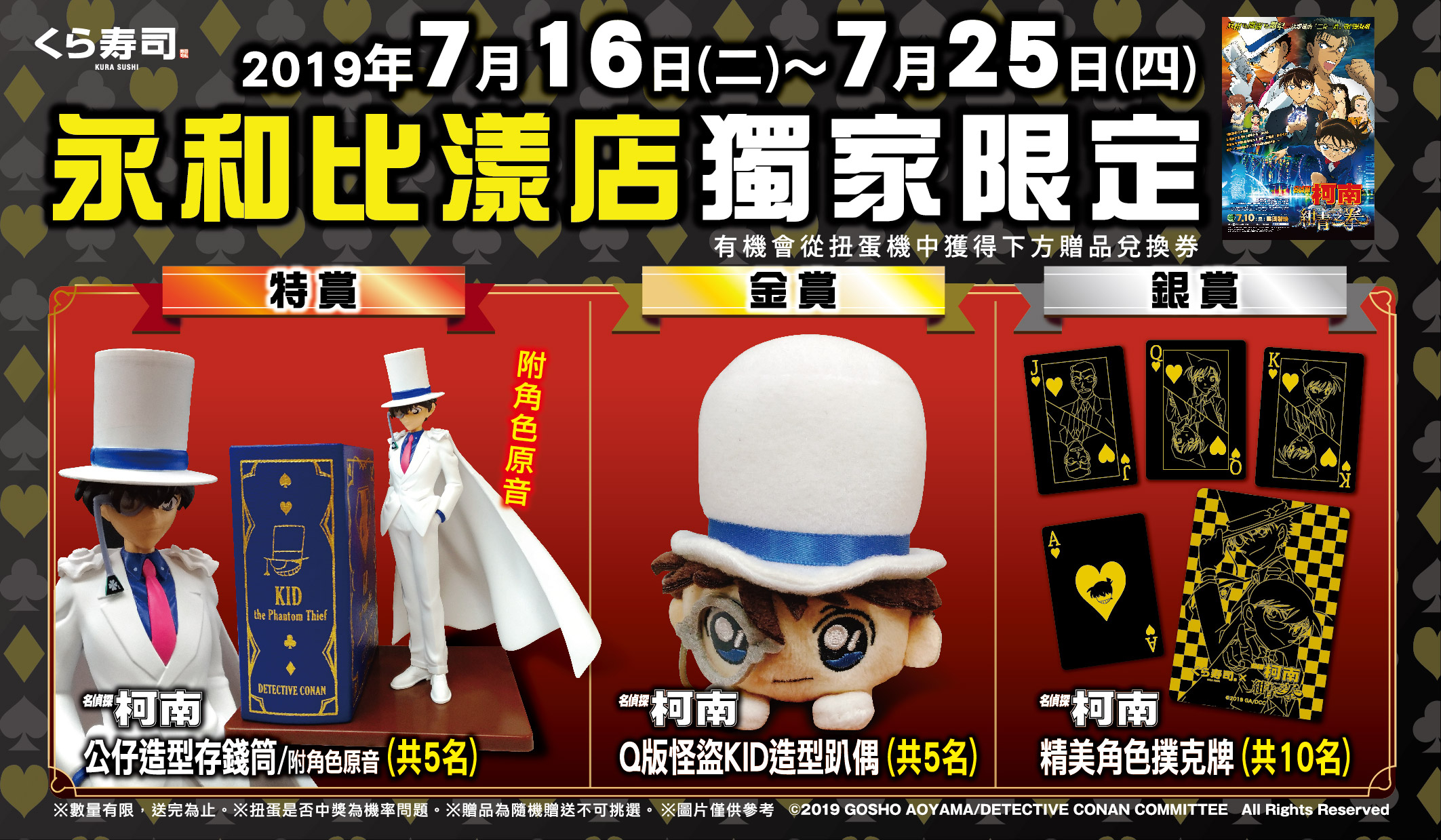 ▼此外,還有機會從藏壽司著名的「扭蛋」中抽出3款限定柯南聯名大禮兌換券,包括銀賞「名偵探柯南精美角色撲克牌(10名)」、金賞「Q版怪盜Kid造型趴偶(5名)」,以及特賞「怪盜基德造型存錢筒(5名,附角色原音)」。