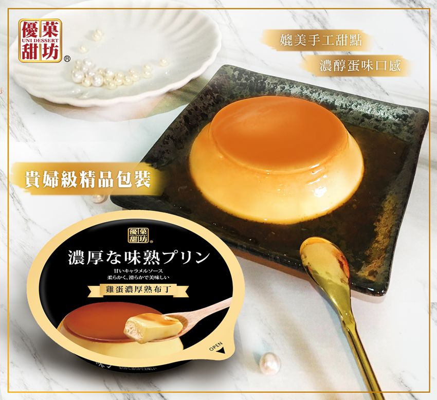 ▼除了聯名商品,另外還有隱藏版人氣甜點「優菓甜坊-濃厚熟布丁」,使用全雞蛋蛋液、嚴謹要求製程和工法、入口紮實綿密、媲美手工現煮手法,包裝採用黑金色調,呈現精緻質感,讓消費者品嚐熟布丁的每口當下,都像在貴婦下午茶餐廳品嚐甜點般感到既幸福又奢華!