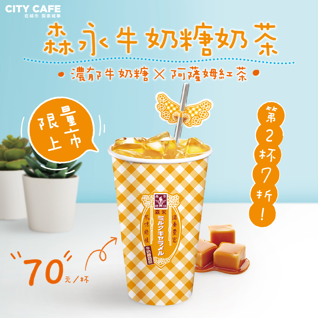 ▼【冰森永牛奶糖奶茶】售價70元,北部限量30萬杯。季節限定商品再次回歸,融合牛奶、阿薩姆紅茶基底及森永牛奶糖香,搭配今夏最新設計杯-時尚菱格紋及天使吸管配件,限量30萬杯。另外從即日起至7月30日,CITY CAFE大杯以上第二杯7折。