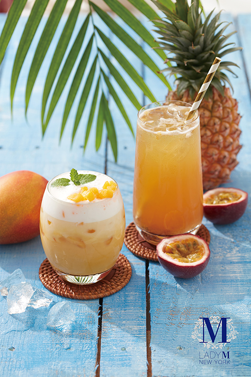 ▼旗艦店夏日飲品:盛夏香芒(前)、金鑽百香綠(後)。
