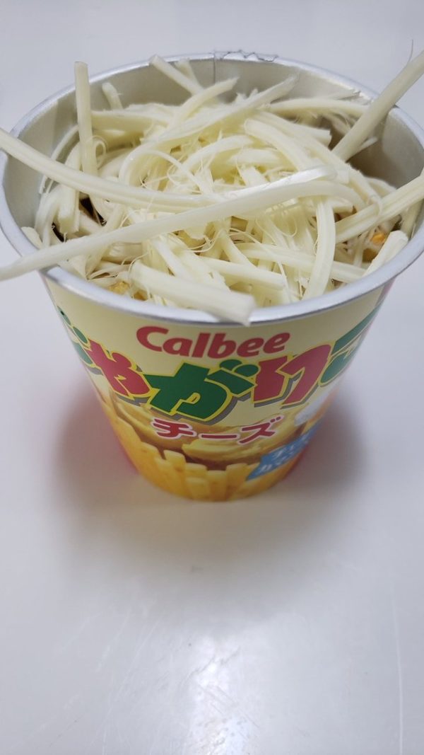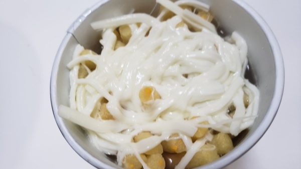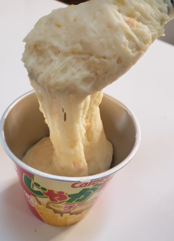 ▼在卡樂比薯條中加入起司,再加入100ml熱水,然後攪拌幾分鐘。