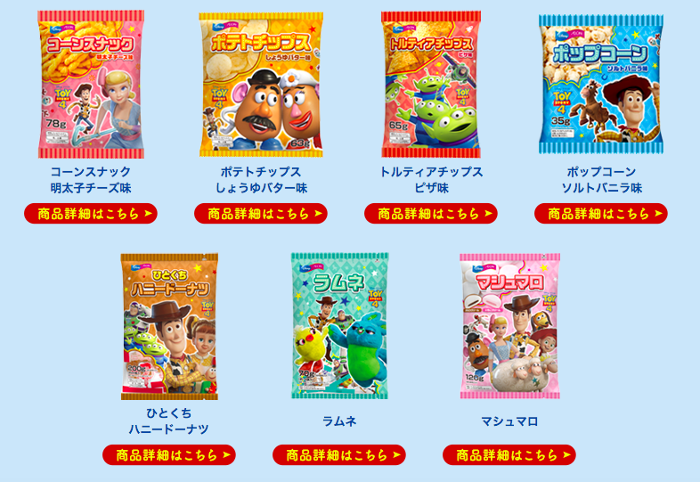▼「玩具總動員餅乾&糖果」,共有七種款式,鹹食是上面四款,分別是明太子起司玉米棒、醬香奶油洋芋片、披薩玉米片、鹽味香草米花;甜食是下面三款,分別是蜂蜜甜甜圈、碳酸糖以及甜甜圈棉花糖。