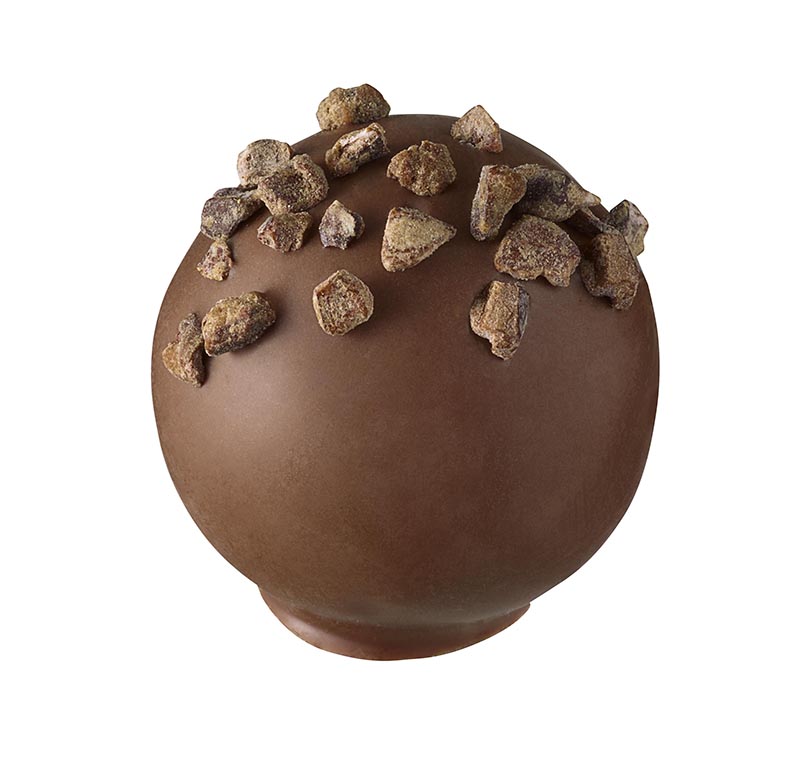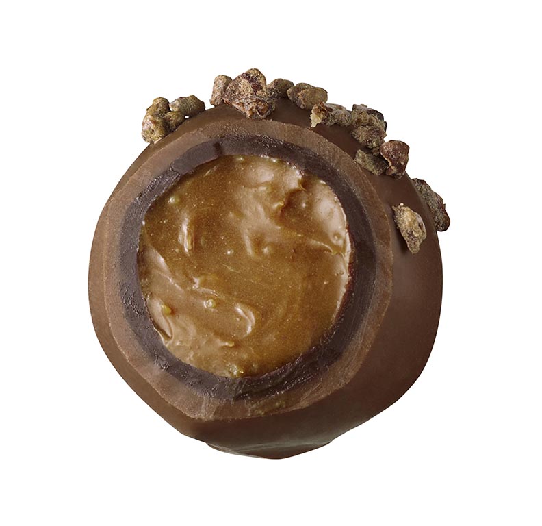 ▼「海鹽焦糖」牛奶巧克力內包裹著美味的海鹽焦糖餡料,頂部點綴著香甜可可粒。