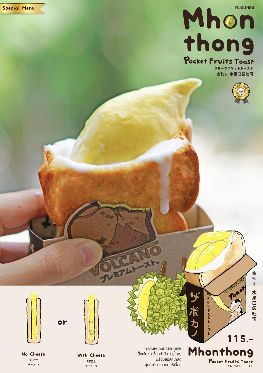 2019年07月26日泰國金枕頭榴槤憑藉滑順香甜的口感令無數榴槤控欲罷不能,泰國清邁一間人氣甜品店THE VOLCANO就將整粒金枕頭榴槤夾進吐司裡,再加入濃鬱椰奶醬和牽絲起司,一推出就迅速走紅,吸引了不少網友朝聖打卡。