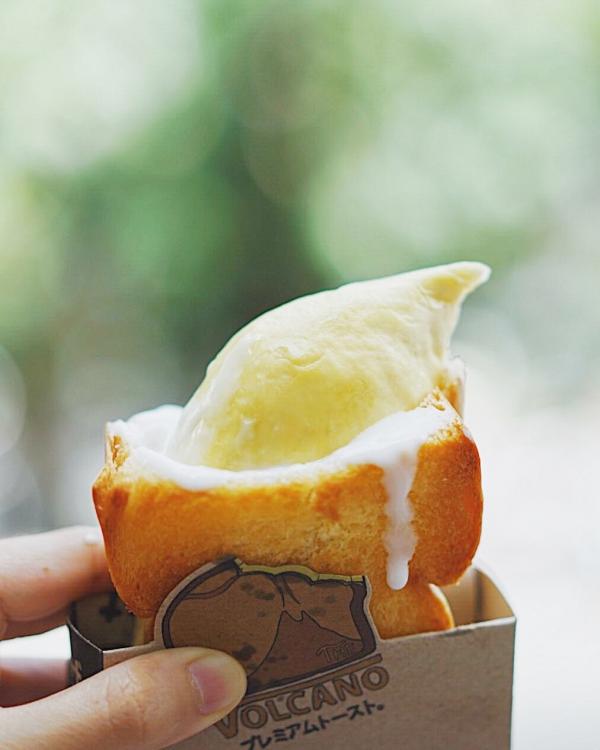 ▼THE VOLCANO以牽絲口袋起司吐司知名,這款榴槤起司吐司,是將丹麥吐司塗上特製的奶油後,烤成金黃色,裡面夾著一整粒去核的金枕頭榴槤,用料非常足。