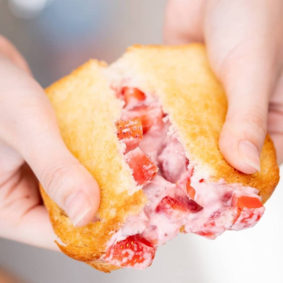 ▼超多飽滿草莓肉的草莓起司吐司。