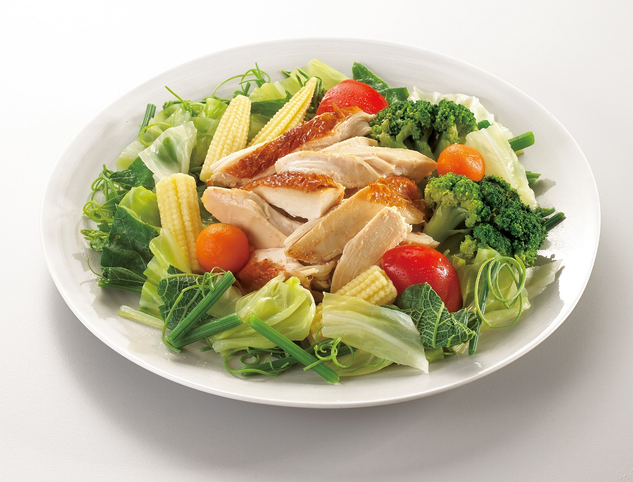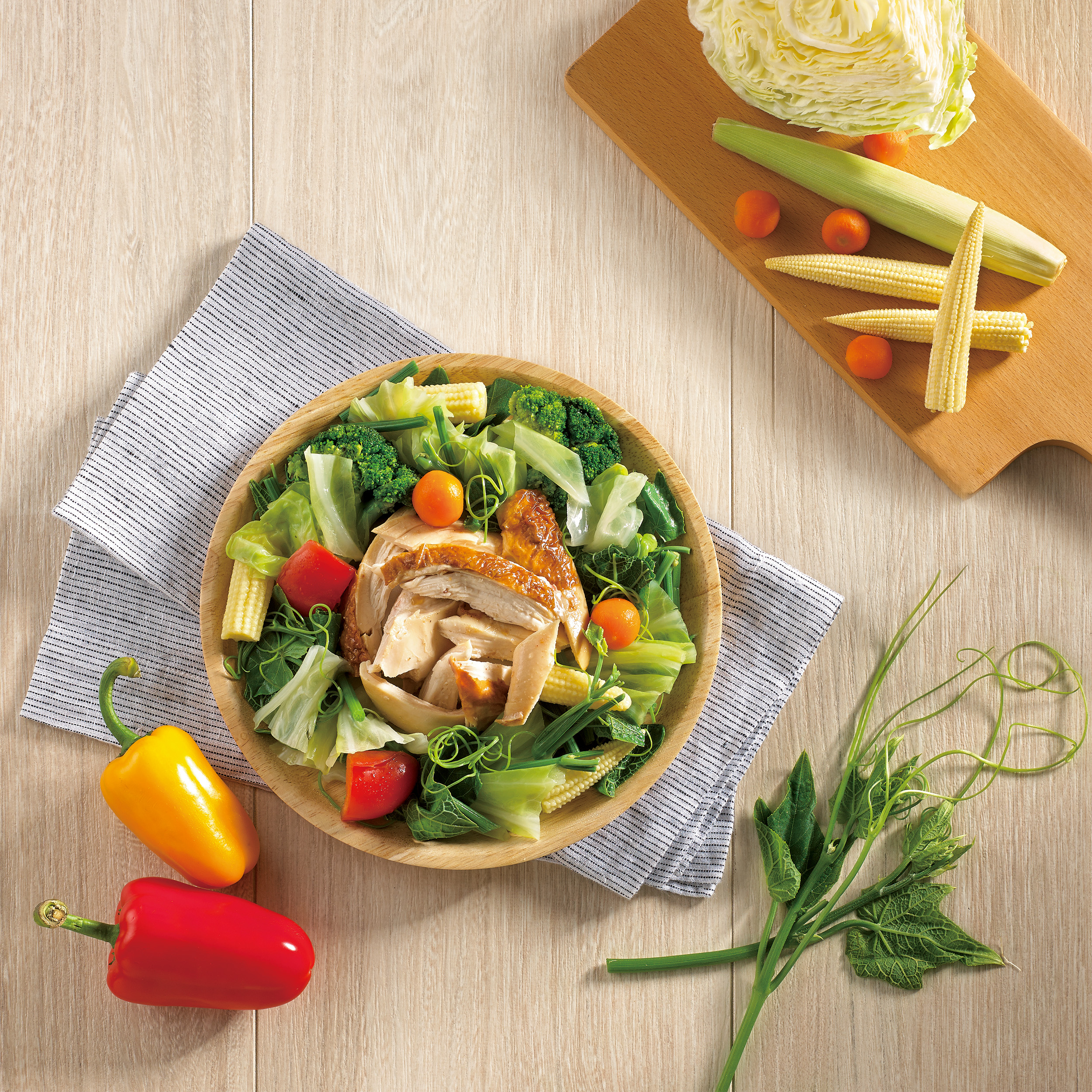 ▼1.鮮蔬手撕雞:以大家最愛吃的夜市美食「鹽水雞」為靈感,將21香草烤雞剝成大小容易入口的雞肉,拌上高麗菜、青花菜、玉米筍等6種蔬菜。