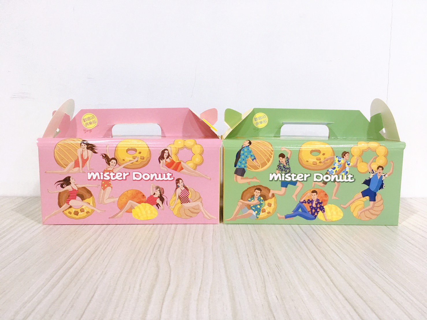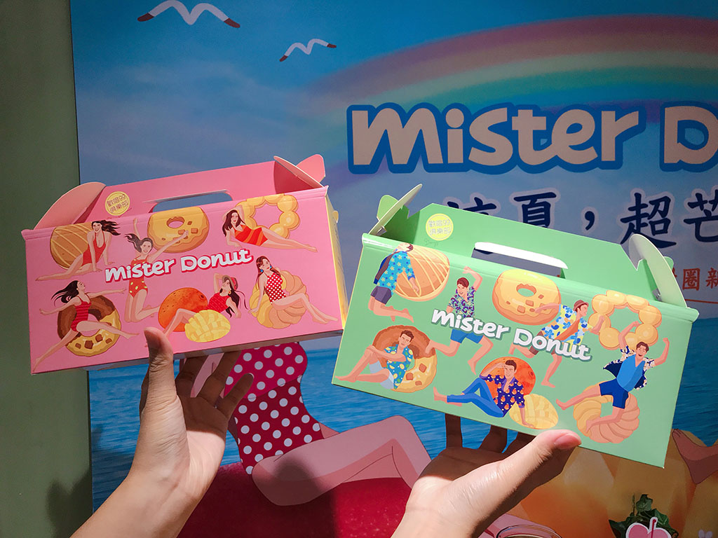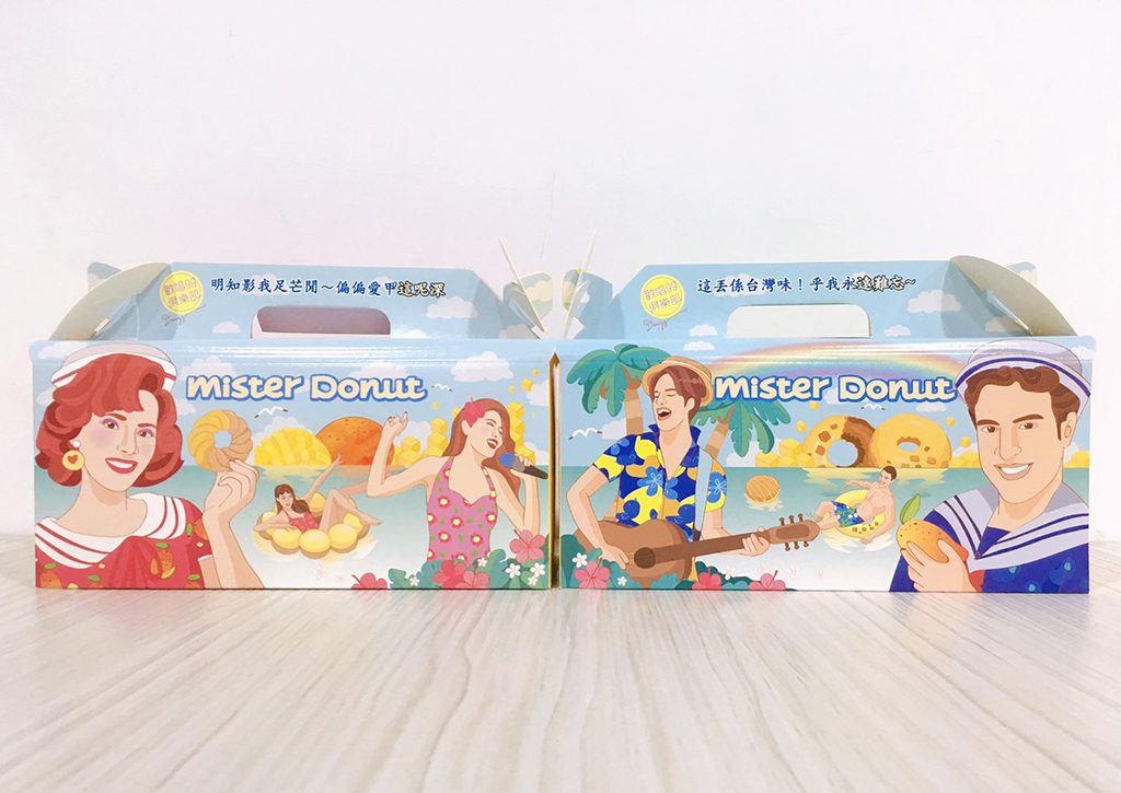 ▼近年來,文創當道,針對本次新品Mister Donut更攜手LINE貼圖插畫家「歡唱99俱樂部」推出芒果季限定包裝盒。一男一女共兩款設計,「卡拉OK女郎」與「純情男子漢」化身為代言人,現身紙盒深情對唱,正反兩面、左右兩邊都有不同搭配。提著紙盒走在路上,整個人更是蝦趴了起來!